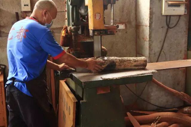 原木运回工厂后,木工根据目标产品进行选木,如餐椅扶手、背板和脚料选用弯的原木,家具面板选用直径大、木纹好的原木,再依据用料需求将原木界成不同规格、厚度的板材,满足长短搭配,综合利用,减少浪费,节约红木稀缺资源。