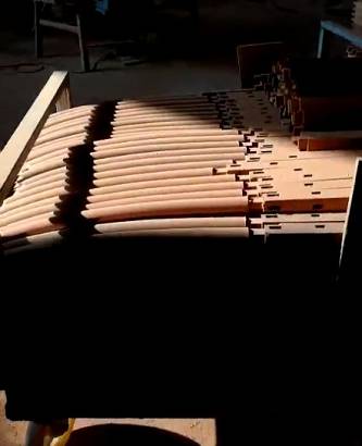 在完成开榫凿眼后就是起线打圆。现在,许多红木家具制作工厂都使用机器来起线打圆。起线是指将设计好的模板图案放在部件上,用笔将轮廓描绘出来,根据描出的边线,使用带锯机锯出高低起伏的轮廓来。打圆主要目的是让表面看上去更圆润,手感更舒适。