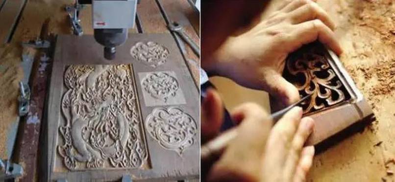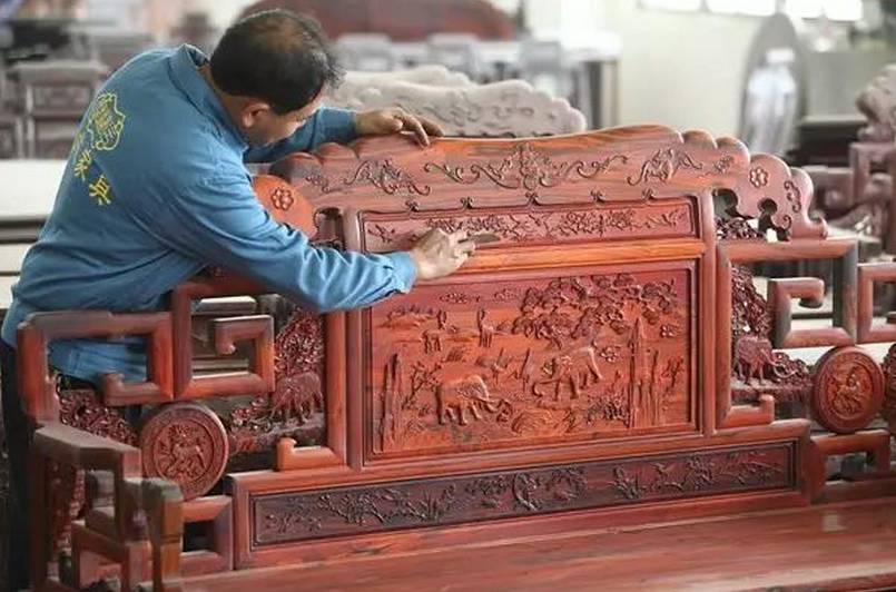 般红木家具都有一些或简单或复杂的雕花来装饰,所以在组装以前,木工要把需要雕刻板材送到雕刻车间,而雕刻就是一个非常费时间的细活了,而且根据雕刻方法的不同,工人的熟练程度和花样的繁简,需要的时间也大不相同。