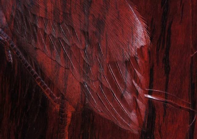 所谓"丝翎",源于翎毛,因翎毛画是工笔国画的一种门类技法,"丝翎檀雕"通过"取神得形,以线立形,以形达意"获取神态与形体的完美统一。