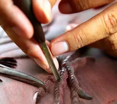 三角刀外形呈“V”字形,用于刻出较长的边线、草褶、丝翎等。不同比例图幅对应的不同比例大小鸟禽羽毛应使用适手角度的刀具。在握持刀走丝过程中,手指要握紧刀柄,出刀一定要平稳不能打颤,一根毛发与下一根毛发间距需保持一致,在毛尾部需有一定弯曲收尾,粗细在根部要粗到尾部相应变细。