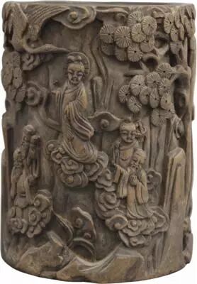 清代根雕笔筒,高12.2厘米,呈上大下小中间卡腰之势。作者利用树根的不规则形态,借势雕有挺拔的松柏、刚柔相济的翠竹、飘飘欲飞的垂柳、压弯枝头的果树以及朽木、野菊等各种树木、花卉。利用其起伏多变的天然形状雕出了陡峭的悬崖、起伏的山峦以及小巧玲珑的亭榭。此作品刀法娴熟,刻画精微。松干栉疤孔陷纹凸、感觉真实,竹枝树叶层次分明。在表现手法上浅浮雕、中浮雕、高浮雕相互运用,相得益彰,是件不可多得的艺术品。