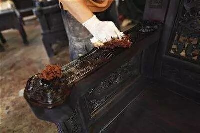 红木家具作为高档、贵重的木质家具,它比一般的普遍木质家具对涂料有较高的要求,涂饰工艺也较为复杂,其通常使用生漆工艺来处理家具表面。红木家具擦漆的过程中,一层层将生漆打磨揩进木制品表面的毛孔内与木坯混为一体,不但保护功能更胜一筹,且可防腐蚀、耐酸碱、耐高温、防火,而且随着使用年代久远会越来越光滑。