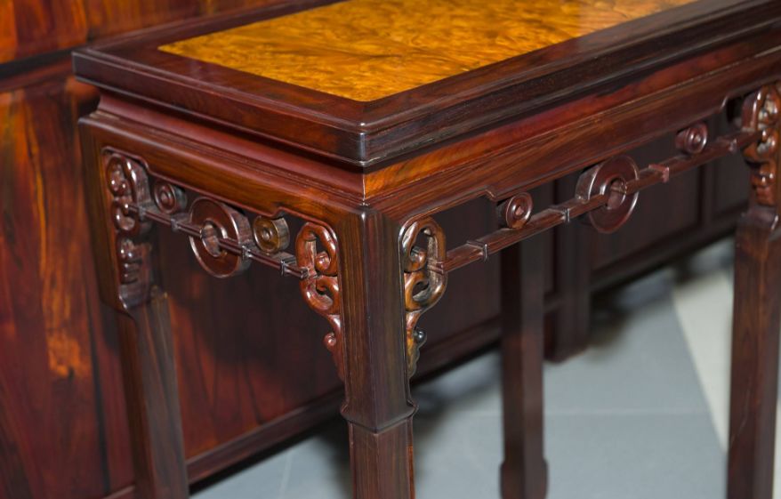 如果红木案面上的物品很笨重,案面承受的压力非常大。案面两端因有案腿支撑,不算吃力,但案面中间却是悬空的,时间长了会有塌腰的危险。