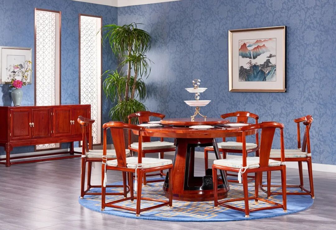 中国传统的宇宙观是“天圆地方”,日常用具大多造以圆或方形,餐桌也是其一,蕴含古人哲学智慧。春满人间,形如满月,聚拢人气。随着红木圆桌轻轻转动,一家子和气融融。