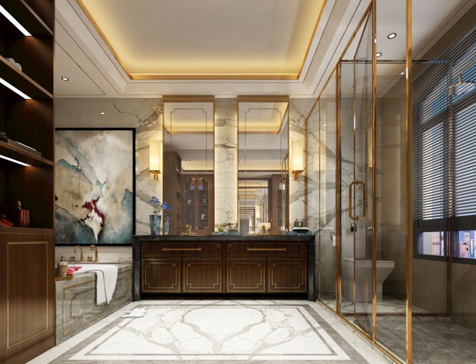 8、卫生间的镜子子可以稍大,既可将污气反射出去,又有梳妆敛容之用,此外亦可增大视觉面积及拓展视觉空间。