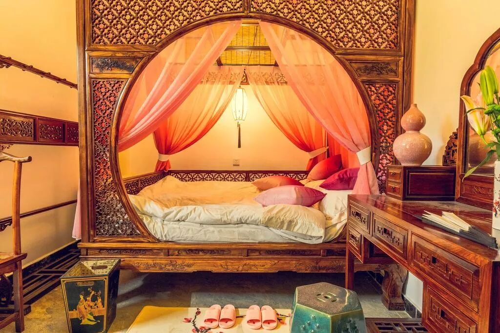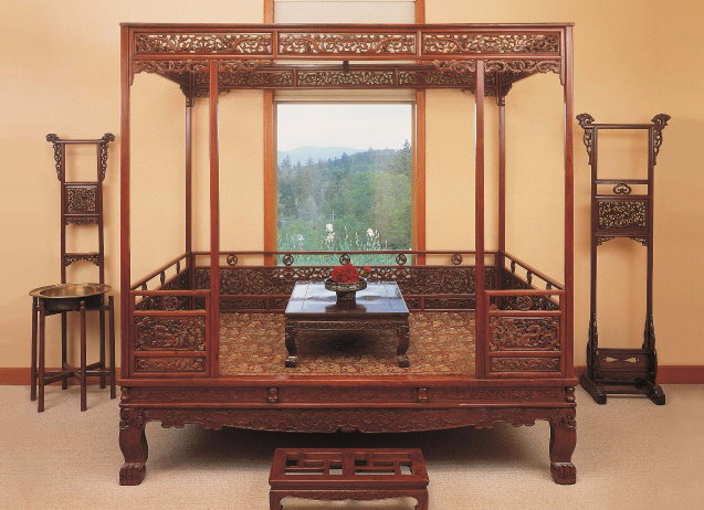 目前在日常生活中见到的中式床,大多是四柱式或者六柱式的架子床,架子上可以围上帷幔,床顶部有顶盖。
