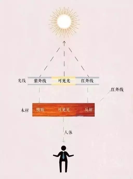 红木木材给人视觉上的和谐感,是因为红木木材可以吸收阳光中的紫外线(380nm以下),减轻紫外线对人体的危害。同时木材又能反射红外线(780nm以上),这一点也是红木木材使人感受到温馨的直接原因之一。