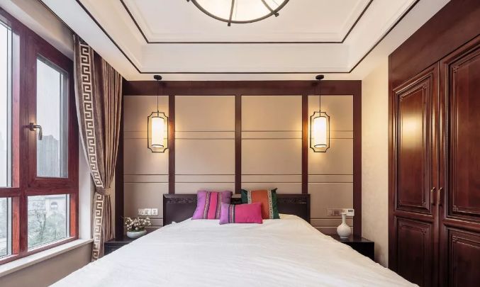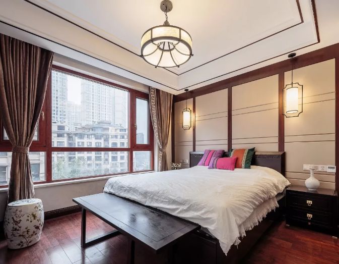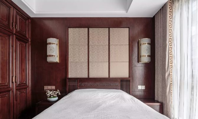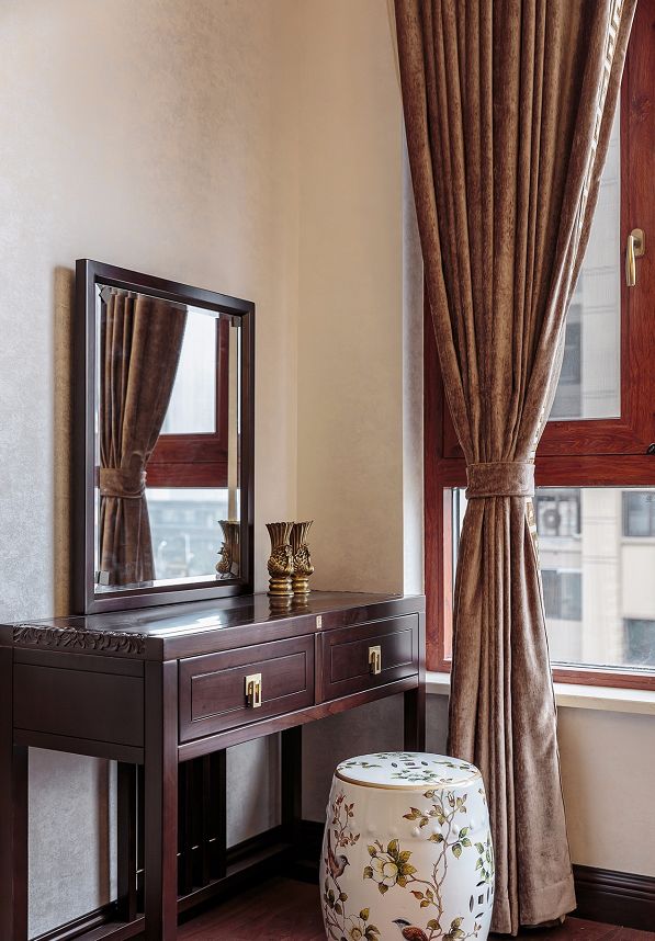 一面泼墨质感的石材铺贴出电视背景墙,为传统中式风格中添加一笔现代元素。