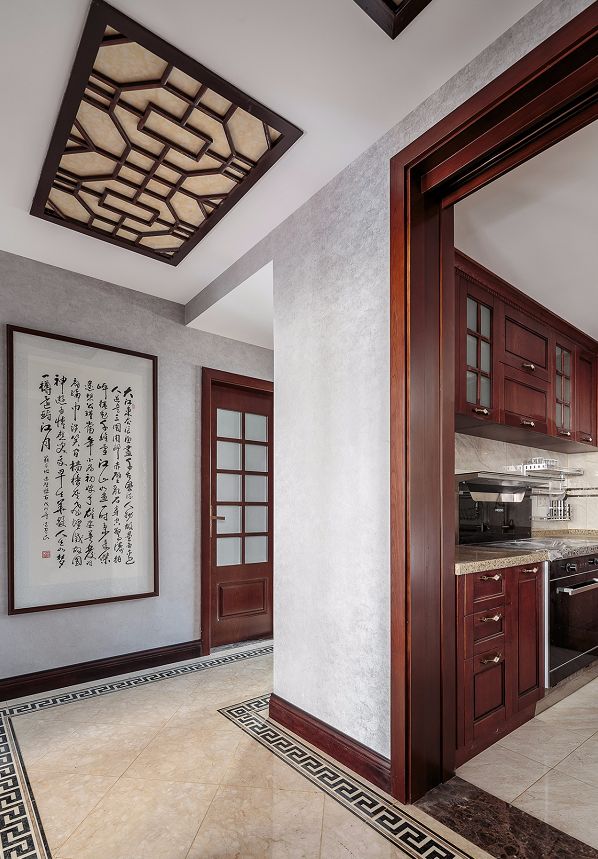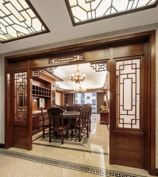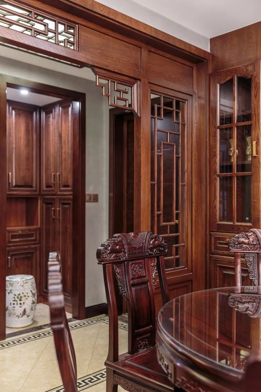 入户走廊的左侧是公领域空间,中式木质垭口与顶面造型风格呼应,圆桌餐厅采用红木家具,彰显端庄大气。
