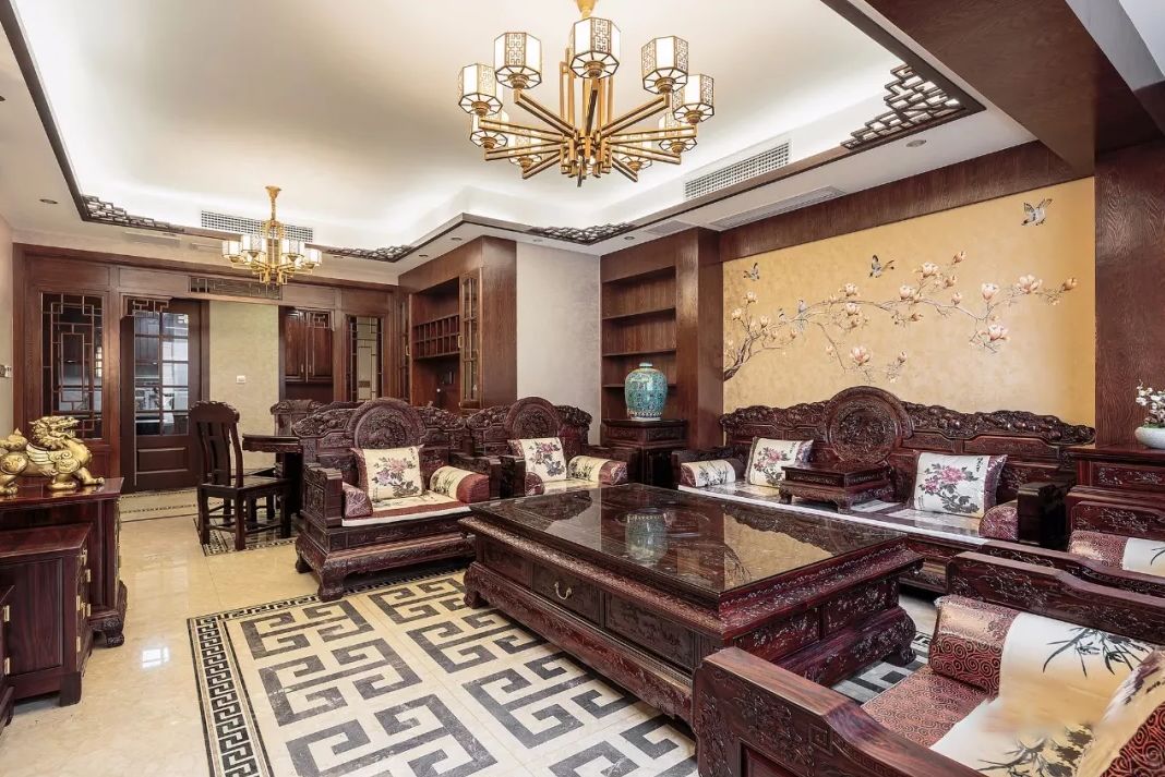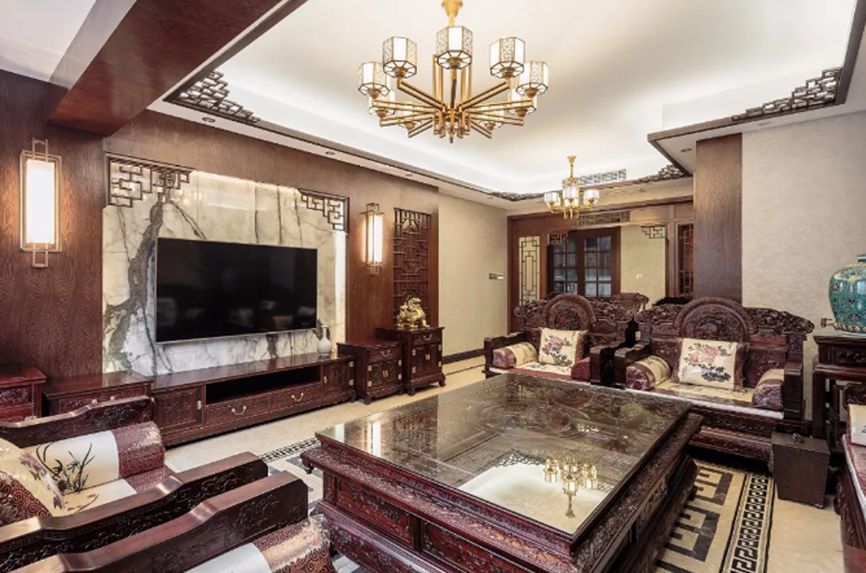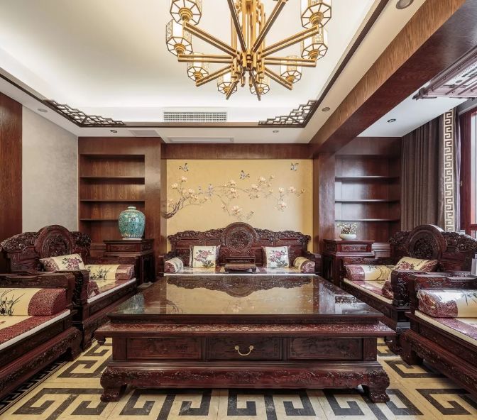 红木家具围,雕花工艺凸显中式家具的精致与讲究。
