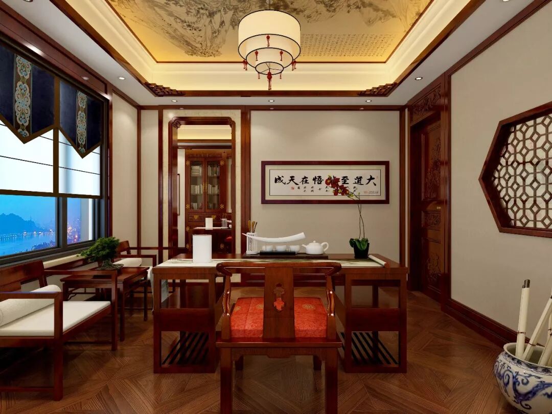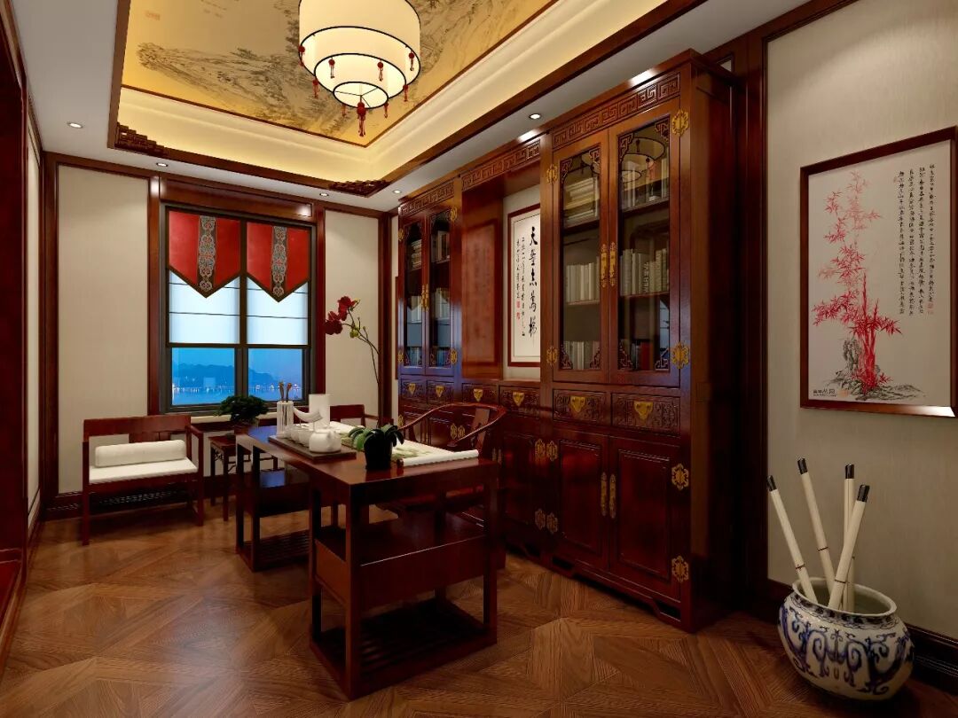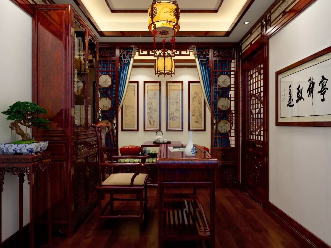 书房中式装修效果图,书房左手书桌上还摊开着墨迹未干的书法,行云流水的字迹可见主人的雄姿英发,右手的小案精致典雅,古朴出尘。