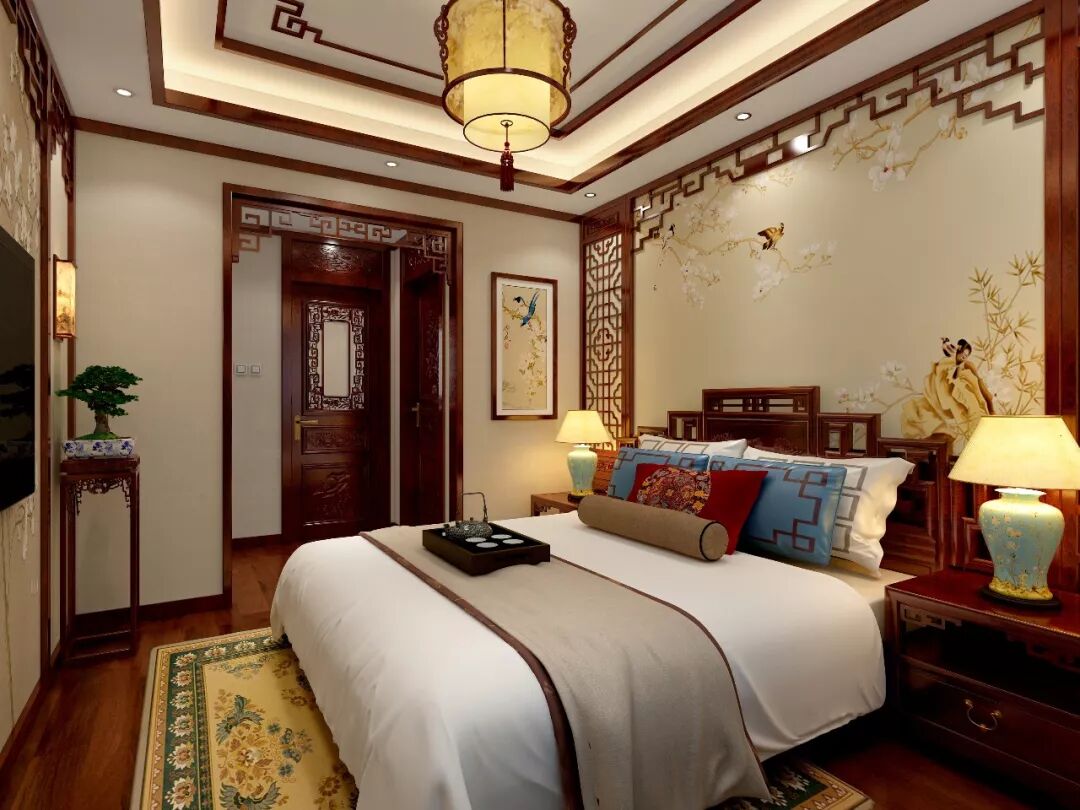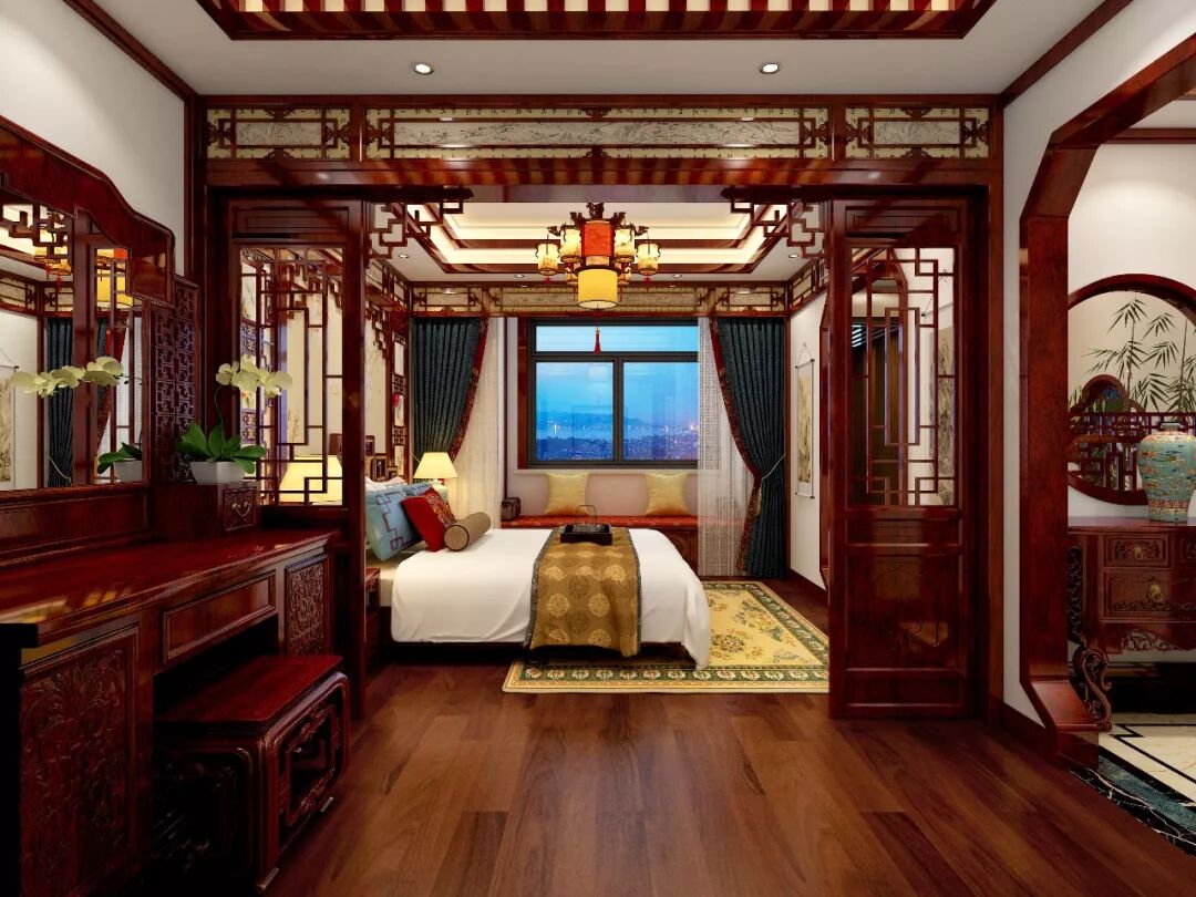 三层卧室可谓豪华雅致,多彩的颜色给人视觉冲击,最夺人眼球的莫过藻井处斑斓的大吊灯,背景墙的装饰画搭配精致的木雕简直无与伦比,最喜欢它的梳妆台,一定要摆上些胭脂粉黛才好看!