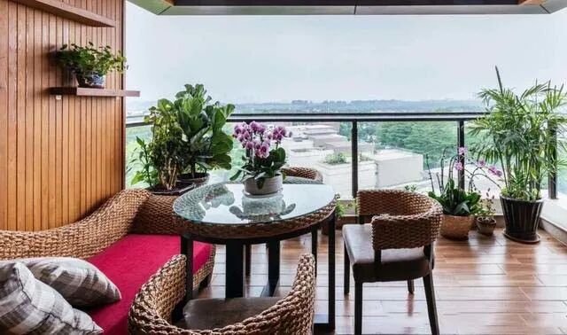 开放式阳台摆放竹藤沙发和靠背椅,墙面也用木板装饰并做上收纳架,放上绿植装点。