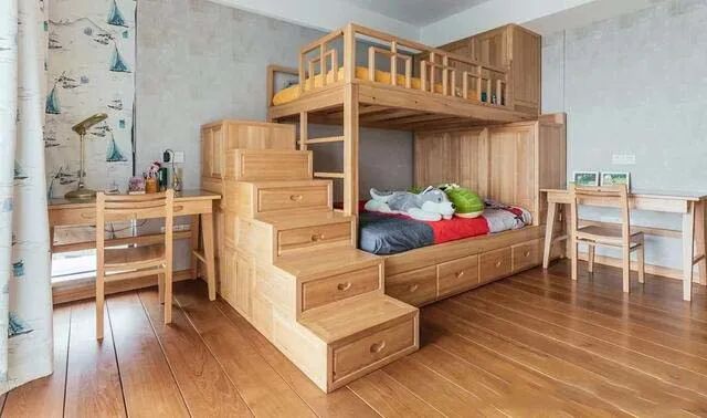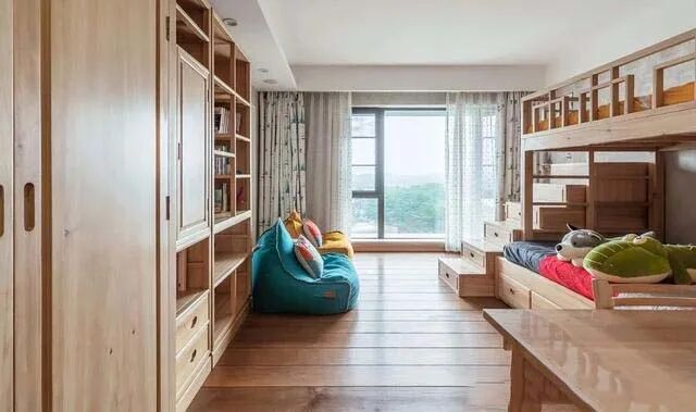 儿童房改用轻快的浅色木质家具,书柜紧连着衣柜,填充了整面墙,双层儿童床旁边摆放台阶收纳柜,增加空间童趣,保证收纳。