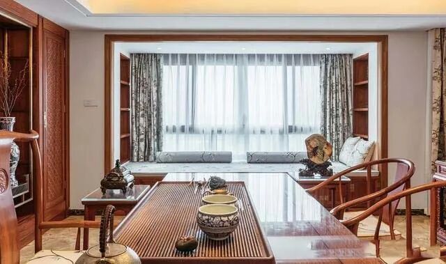 茶室旁边做飘窗卡座,往外的格局让空间更加通透宽敞,两侧做简易收纳架,配上传统中式碎花家纺,大气端庄。