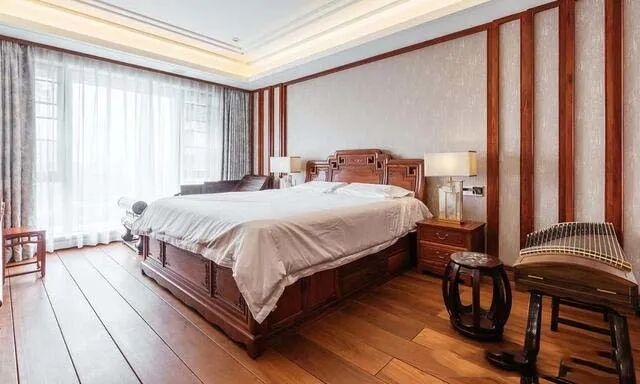 主卧内装修却十分简洁,竖行木质装饰板点缀带金闪的墙布,木床看上去很有"份量",完全能撑住这个大空间,床头柜上摆放新中式台灯,颜色和墙布接近。