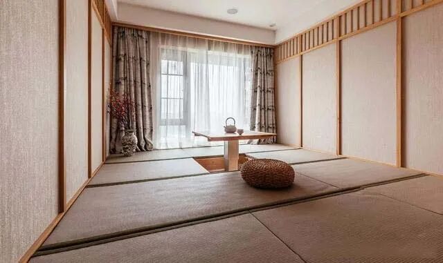 榻榻米房整体设计不留死角,空间很大,但全用竹席软垫覆盖,不需要额外的家具和装饰,墙面是墙布和木框的结合,温馨且有田园感,适合做个宁静的书房和休息室。