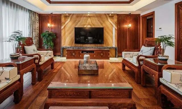 客厅背景墙用木质样式的抛釉砖连接两侧的木质装饰板,在颜色深浅和质感上都做了层次感,光泽感强,和红木的气场相当,整体非常气派。