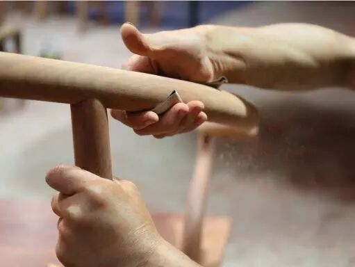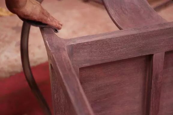 最后就是水磨:用湿布显现出家具上的木纤维和阴湿,然后针对这些情况进行处理。经过这一系列的打磨工作,家具整体轮廓匀称,棱角齐平,整体协调,纹理面清晰、纹路相合,榫卯连接润泽通润。