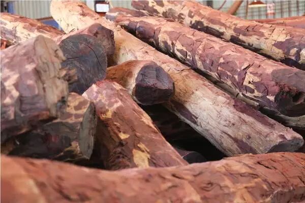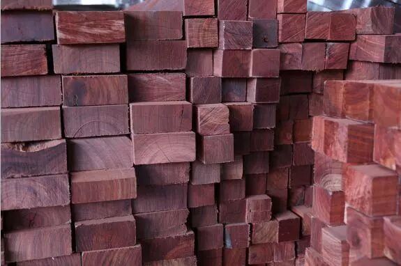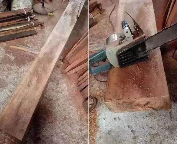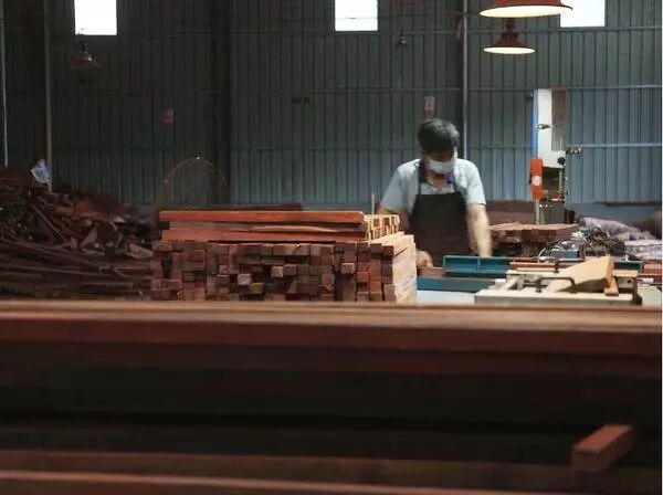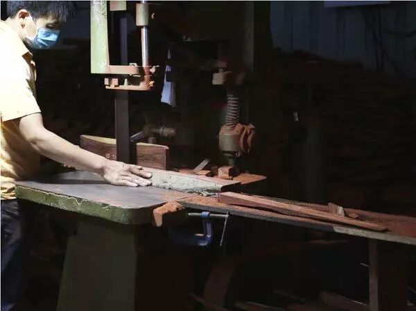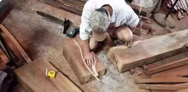 选料有两种,一种是讲究的厂家自己去原产地,挑选、购买原材料,这种花费的人力物力财力都非常大,另一种是最常见的,在当地红木原材料市场选择自己需要的原材料。通常情况下,用料环节从木头买回来,在工厂卸车的时候就开始了。