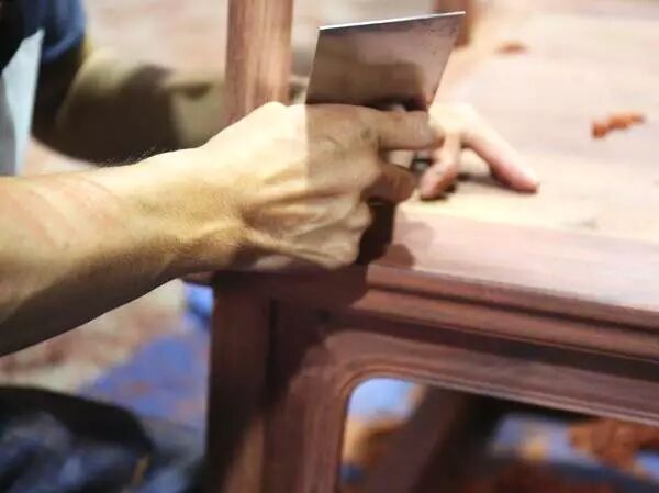 接下来才是整体打磨。家具部位的特点,用各种形制的铁片小刀粗磨,如果发现有裂痕,还要用胶水,木粉对其进行修补,接着用各种粗细不同的砂纸进行打磨,需要耐心和经验。