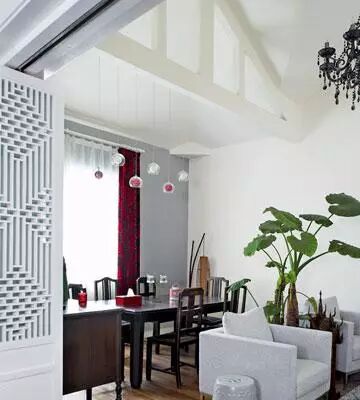 中式门和窗棂,刷了白色和仿旧的灰色之后,形成一种新旧对比的效果,淡化了传统中式家具的厚重感,成就一种新的后现代的中式味道。