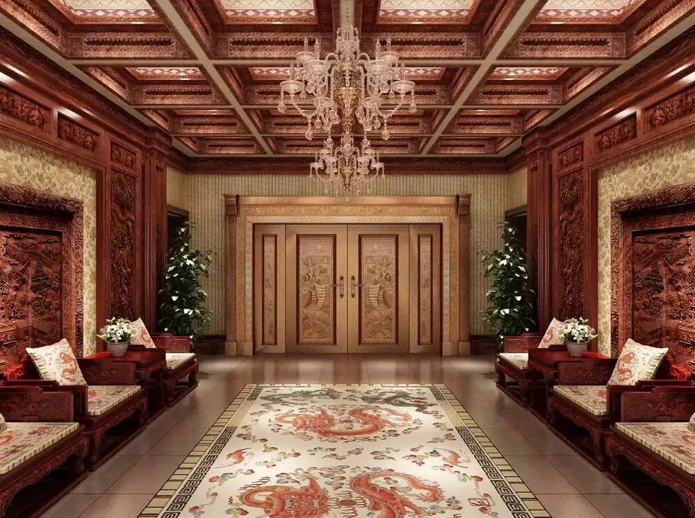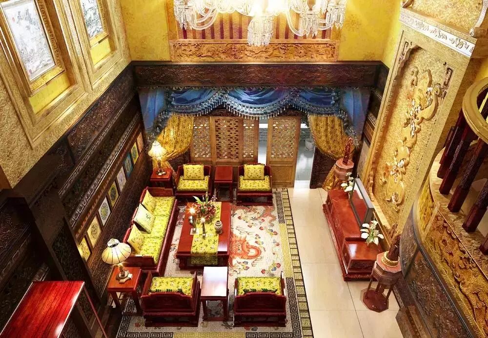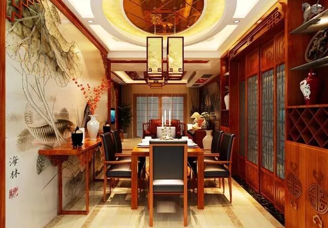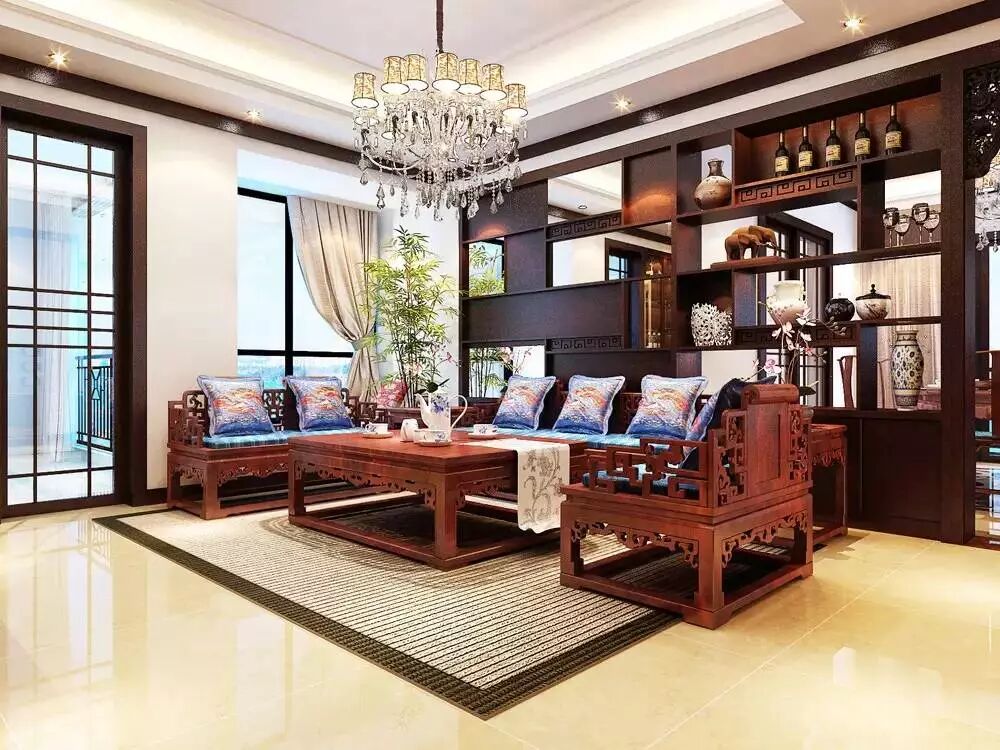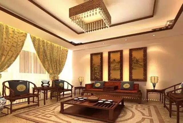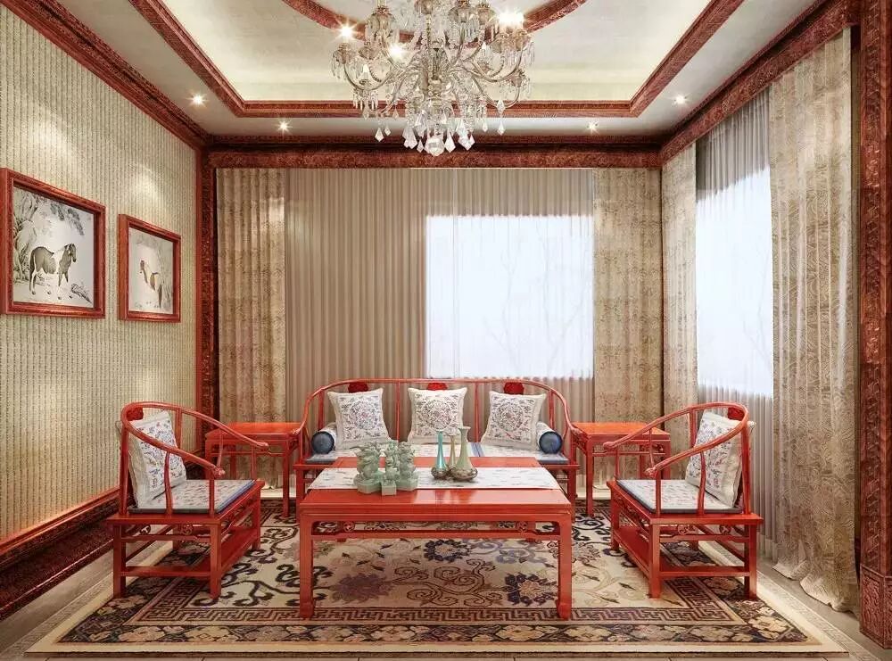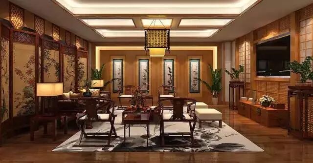 在中式客厅的装修过程中,红木家具的色彩与居室背景、灯光是否协调,这个是需要考虑的。如果居室的背景色较浓重的话,那么一般来说,便不宜选择色调深沉的红木家具。
