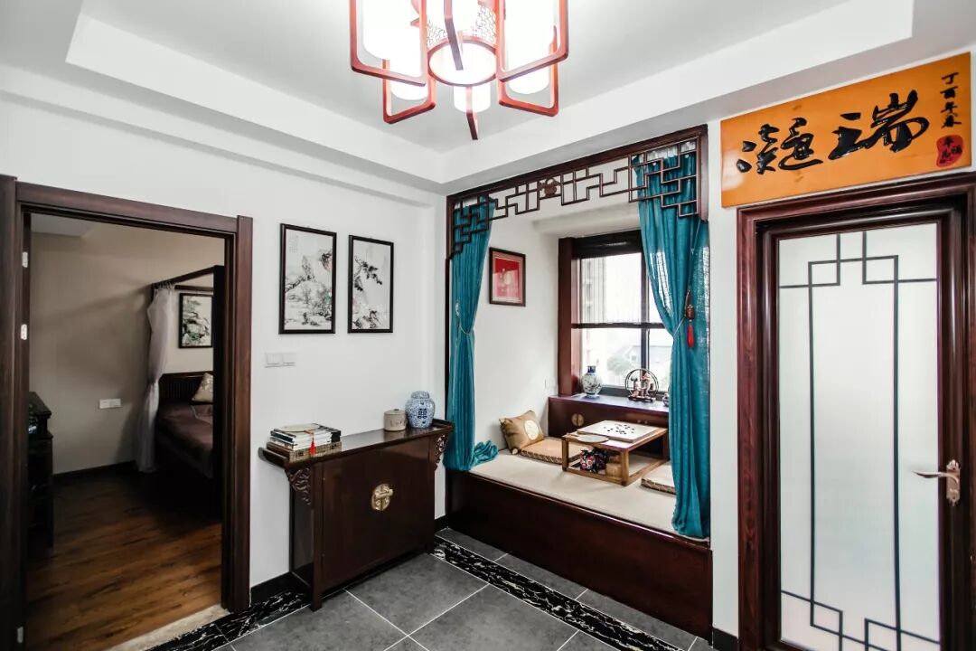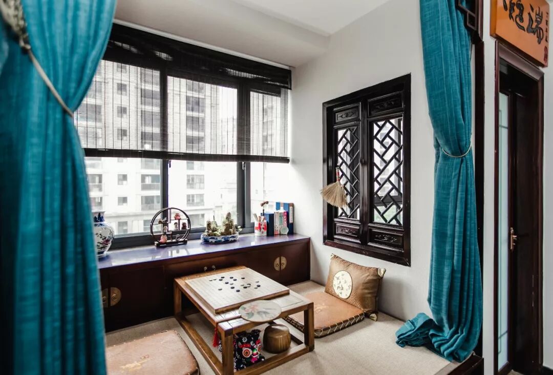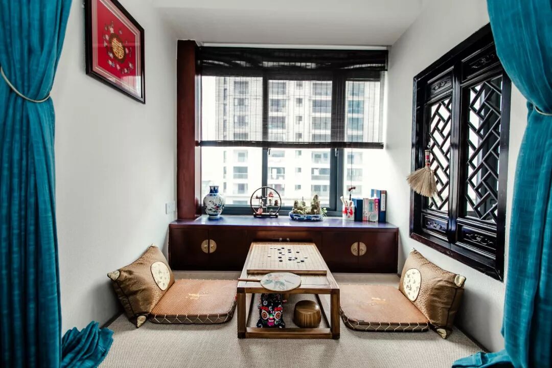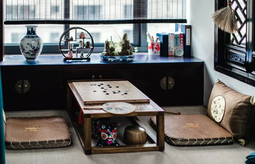 窗边做了一个深木色的收纳柜,典雅的木色软装加上对称的布局显得怡雅大方,营造了一个古色古香的对弈氛围。