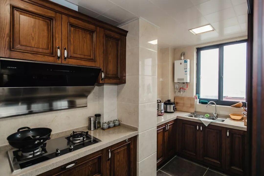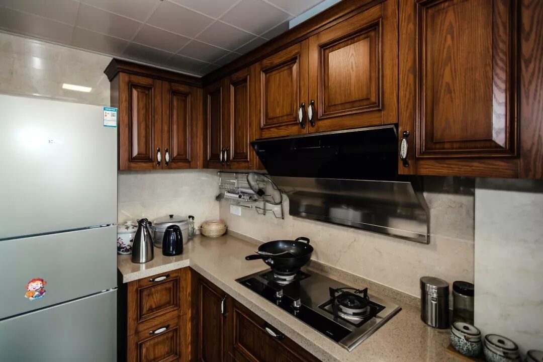 原木质感的橱柜,给厨房也带来了高档的空间感。