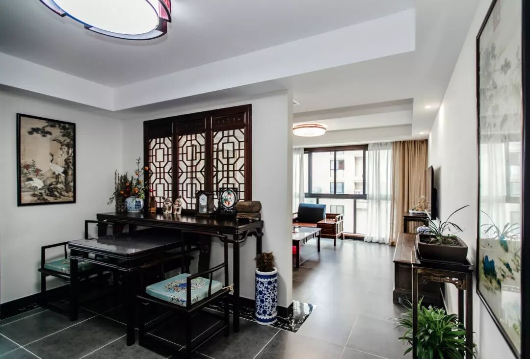 墙面“松鹤延年”的字画,配合几案和端景台的绿植,给玄关空间带来了吉祥和活力。
