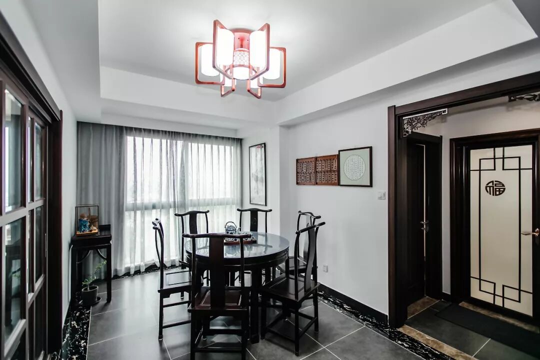 餐厅吊灯是“中圆外方”的木框造型,与圆餐桌和六把餐椅形成两处方圆的相互呼应,带来和谐统一的稳定感。