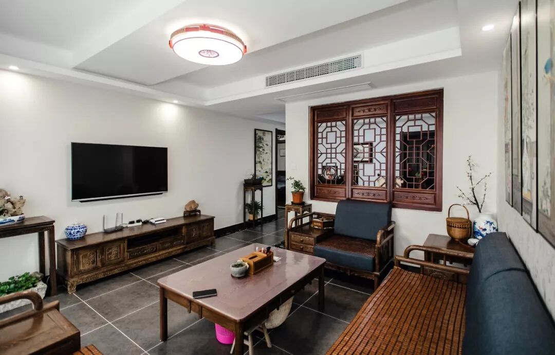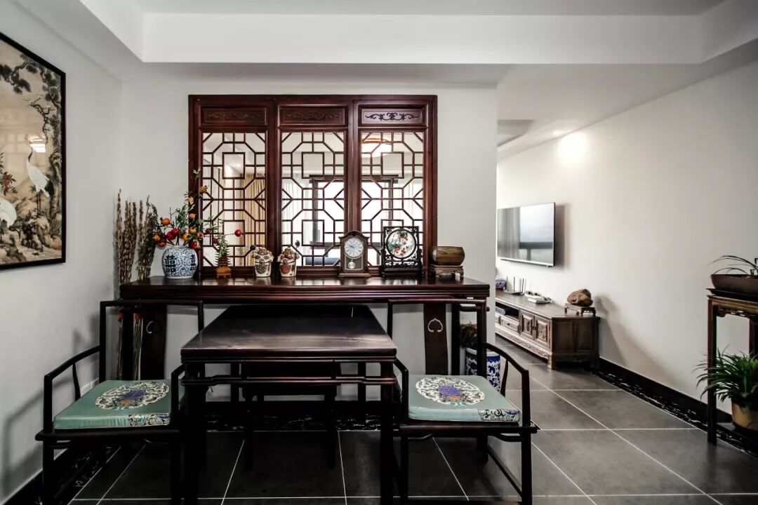 深木色的中式家具搭配,进门就给人一种正襟危坐的肃穆庄重感,几案上的摆件,经过墙面窗棂的衬托,泛出了别致的端庄美。