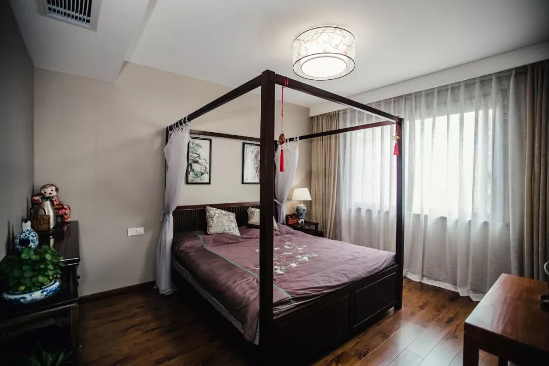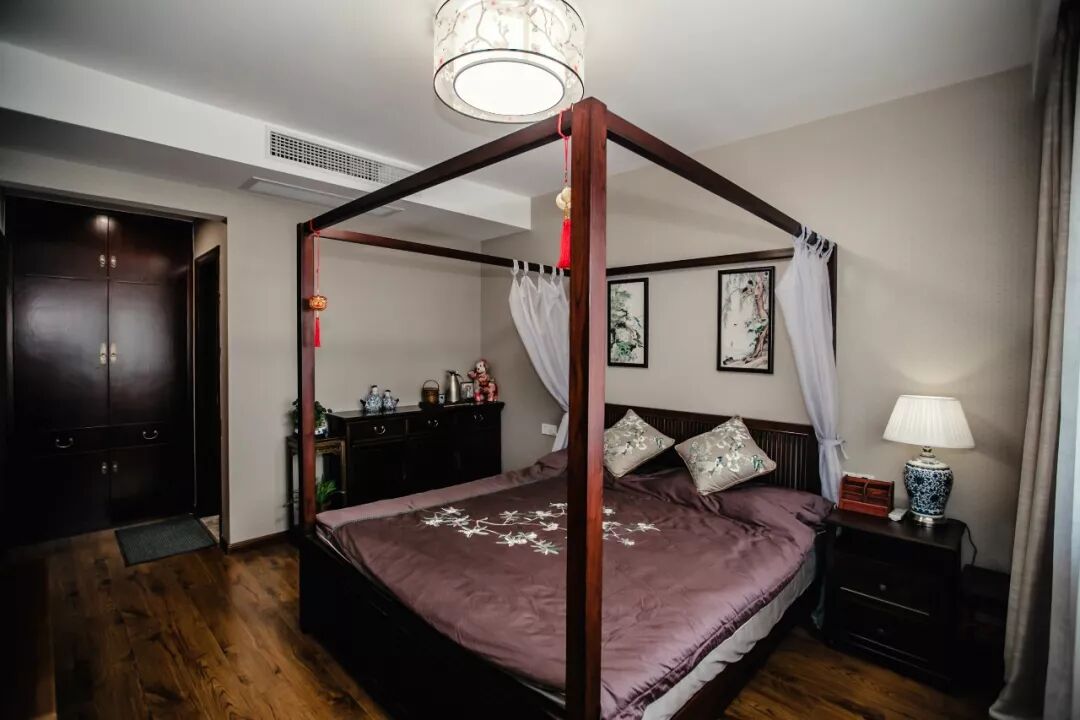 精致的吸顶灯下是一张架子床,在灯光的配合下显得格外的华美端庄。