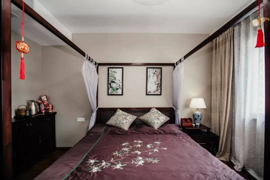 素净的墙面,做旧的木地板,搭配沉木色的家具,以素白的纱帐为点缀,打造了温馨怡人的卧室空间。