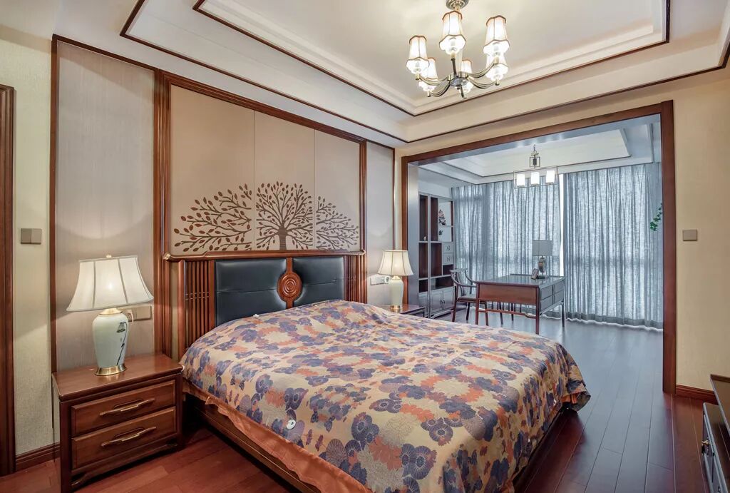 卧房,米色的墙面通过乌金木的黄色过度与米色的墙面搭配,营造出东方精致细腻的宁静氛围。