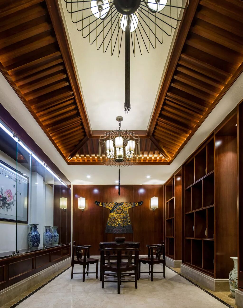 元素简化后的木质顶棚造型,既突出了收藏室和品茶区的文化属性,又很好地契合了现代的工艺处理。