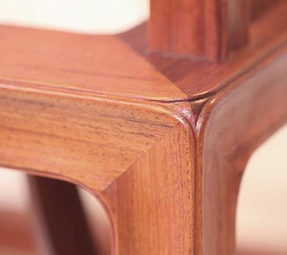 除了整体造型的“柔”,红木家具的设计也更加注重细节的“柔”。明式家具中的粽角榫,表面尖锐,人碰到容易受伤,尤其家中有小孩,不够安全。针对这个问题,某些红木家具生产厂会用“弧形粽角榫”,它的三接面不再是三角齐尖,而是把棱角刮磨得圆润,做成三面弧形,使用过程中更加安全,体现了红木家具设计中的人文关怀,更显家具“柔情”。