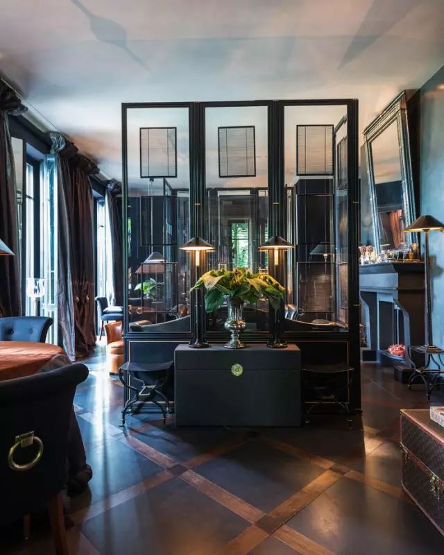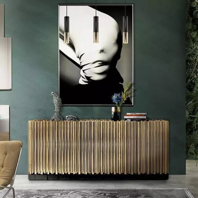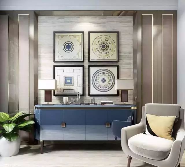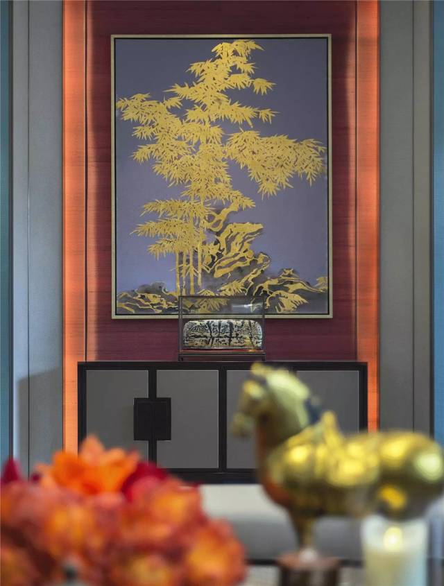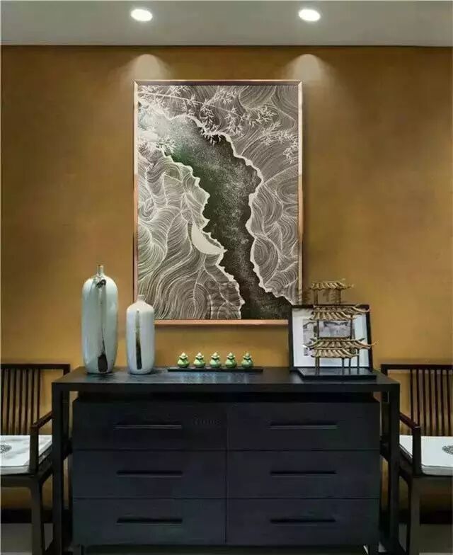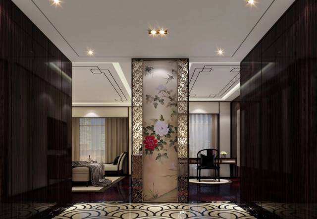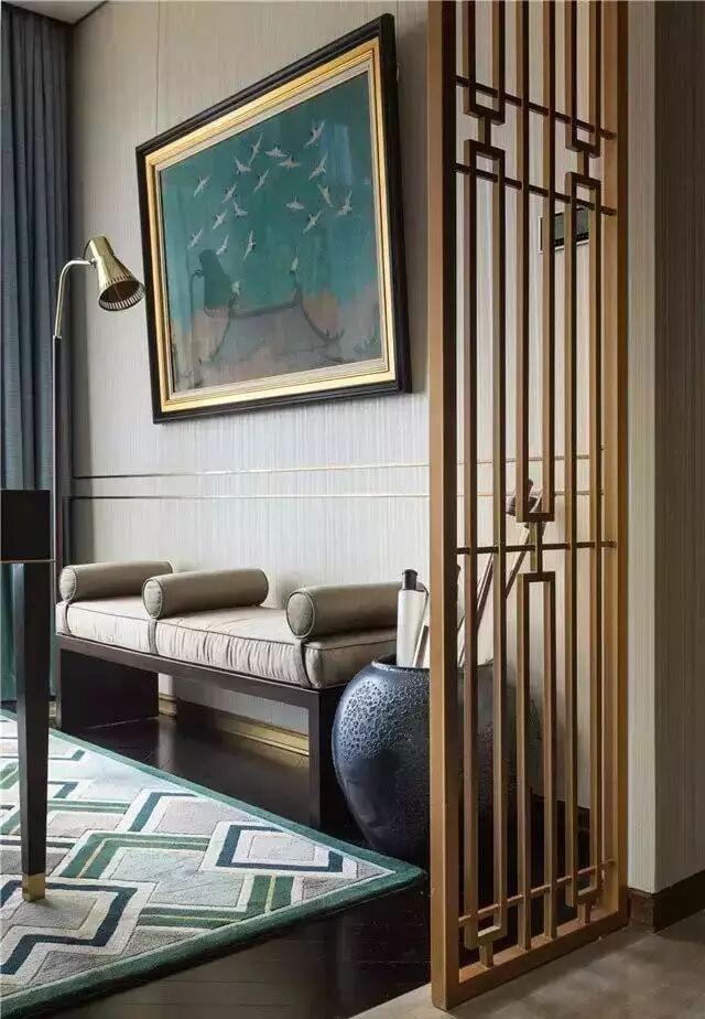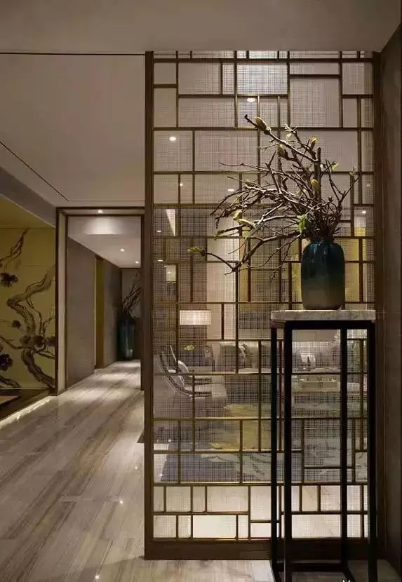 是以隔断下部为完全遮蔽式设计。隔断两侧隐蔽无法通透,上端敞开,贯通彼此相连的天花顶棚,通过线条的凹凸变化、墙面挂置壁饰或采用浮雕等装饰物的布置,从而达到浓厚的艺术效果。