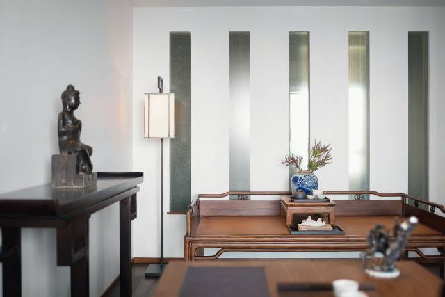 主要以带有不同花格图案的透空木格栅屏作隔断,既有古朴雅致的风韵,又能产生通透与隐隔的互补作用。