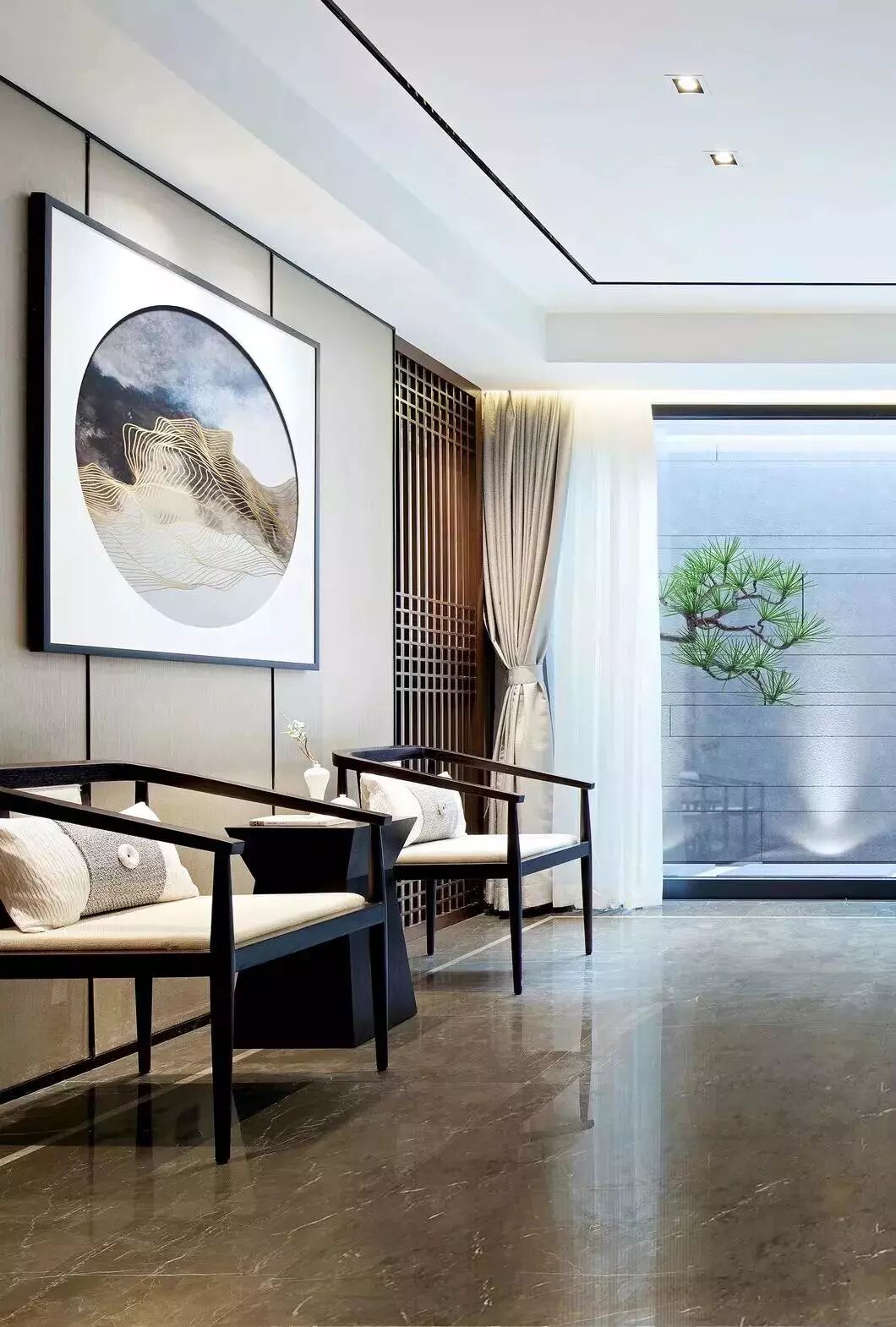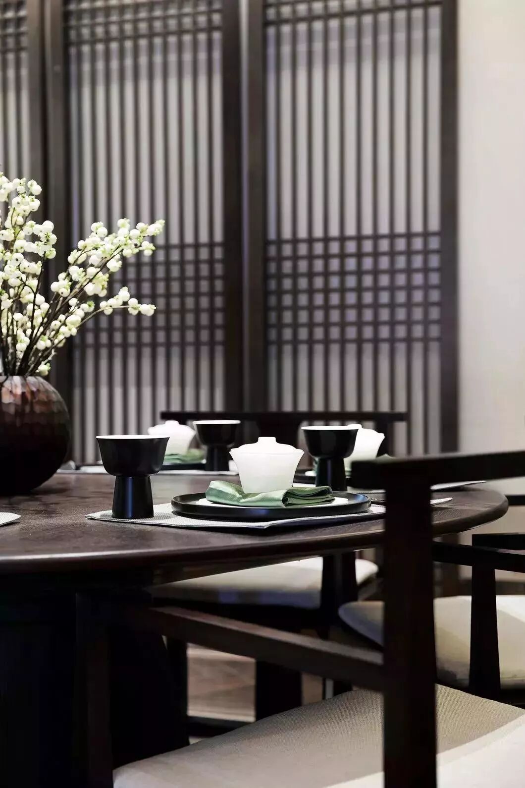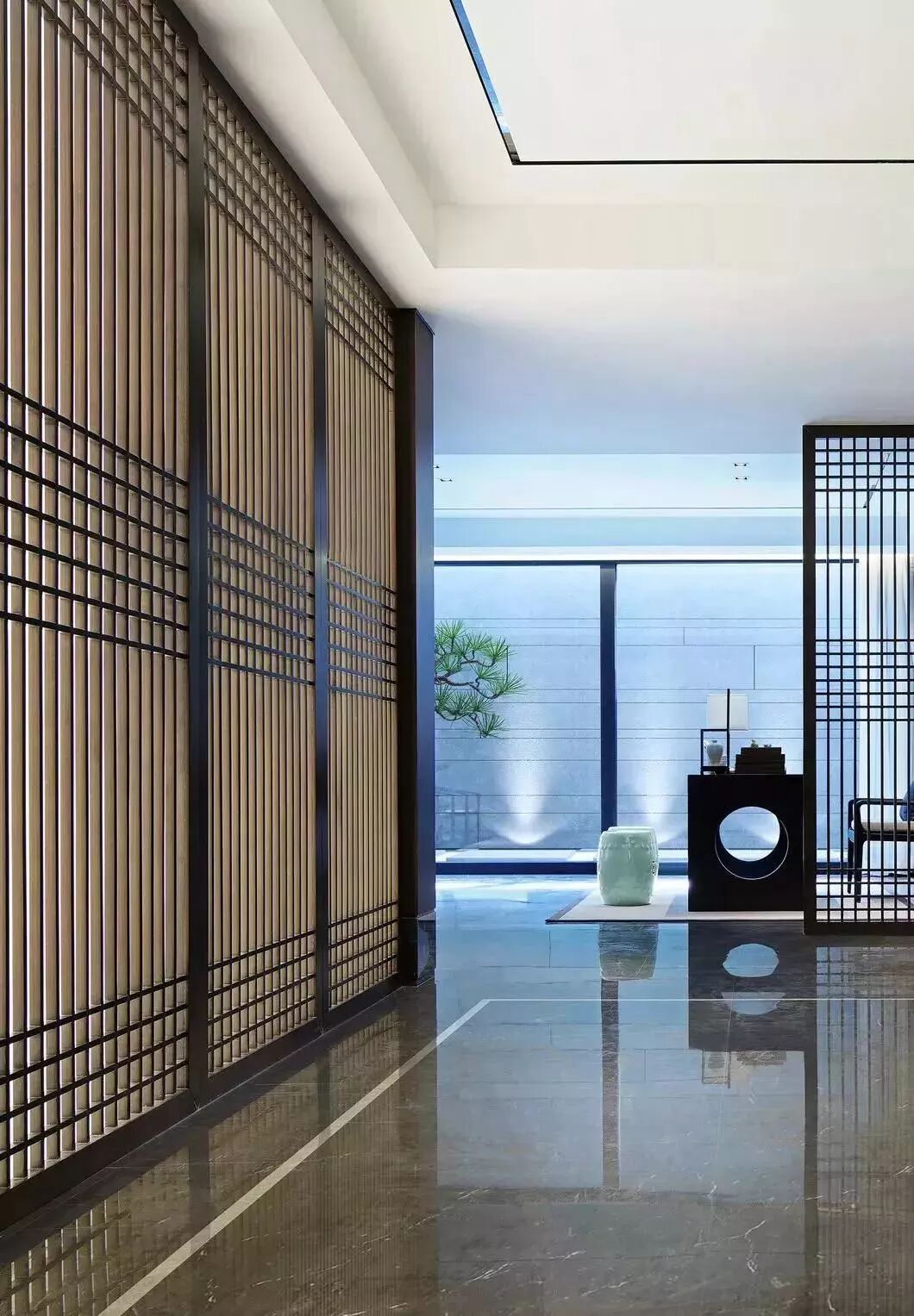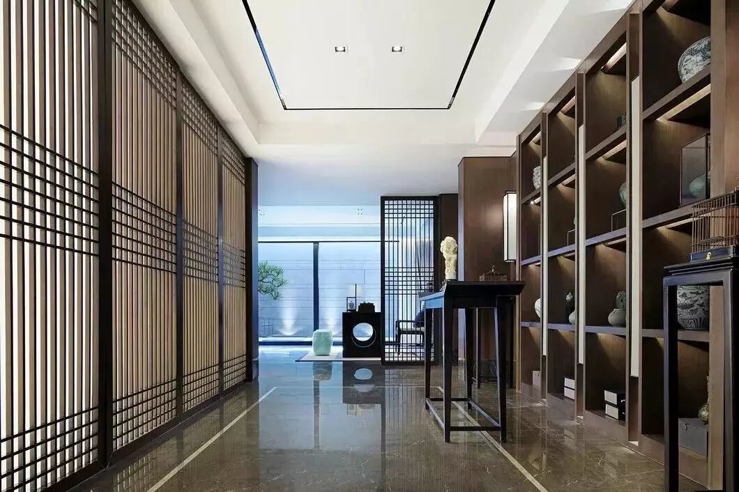 精炼的屏风线条在空间中显得那么有秩序感,多而不乱,密而不杂,隐隐透着光,在传达着中式的静谧风雅。门窗外采光井更是意境婆娑,不紧紧只是引景入室,更是设计师对空间关系的一种直接表达。