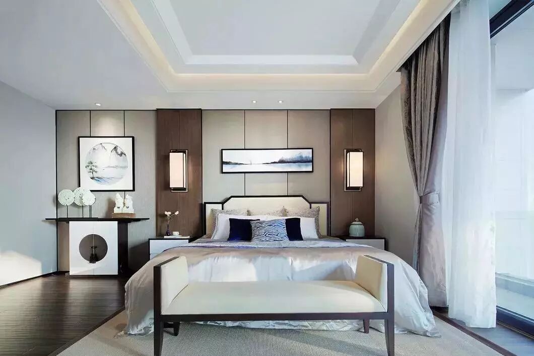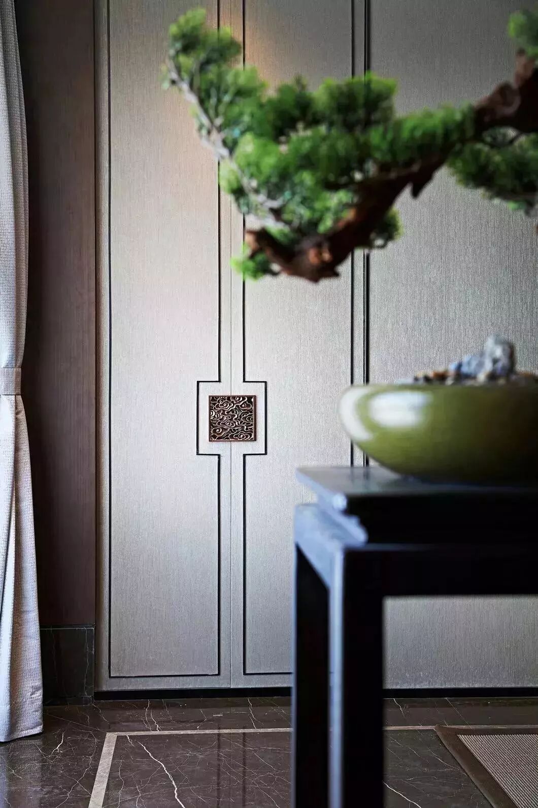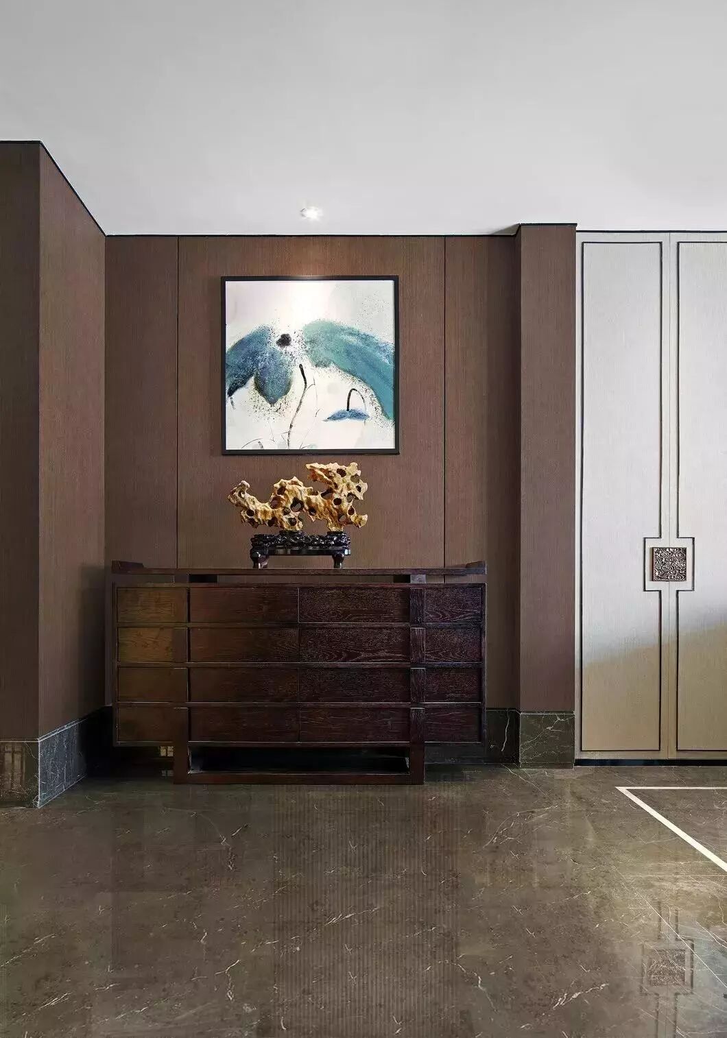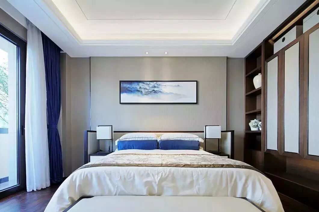 中式的文化是内敛低调的,设计师将“中”字很巧妙的植入到柜门的拉手及墙面装饰上,营造一种低调奢华感。