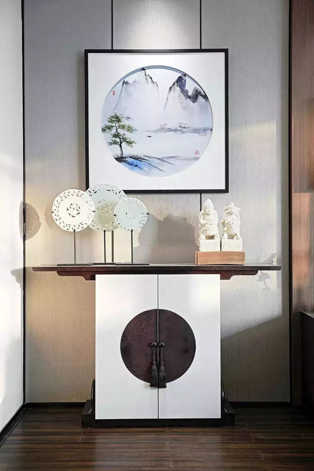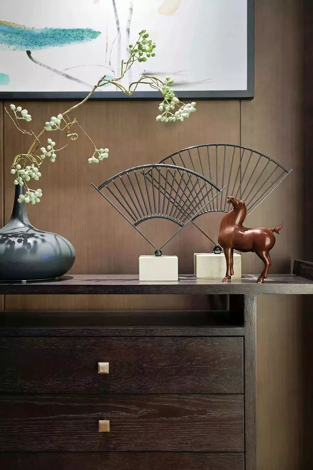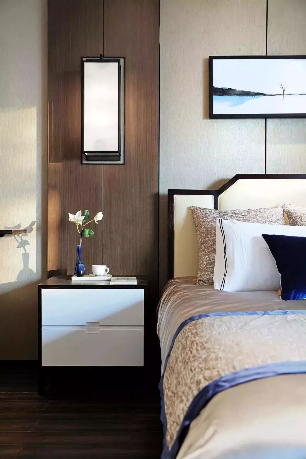 中式的文化是内敛低调的,设计师将“中”字很巧妙的植入到柜门的拉手及墙面装饰上,营造一种低调奢华感。