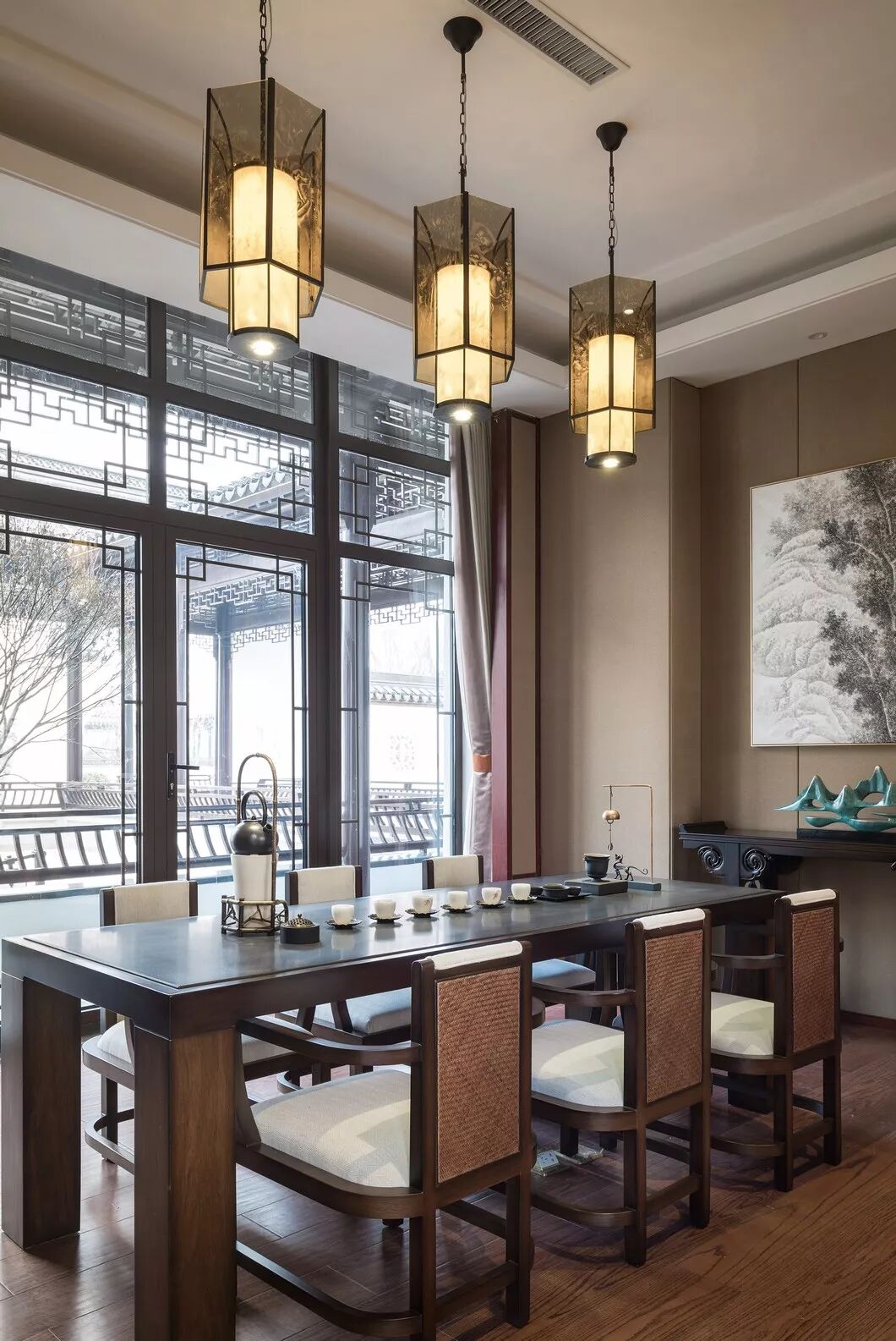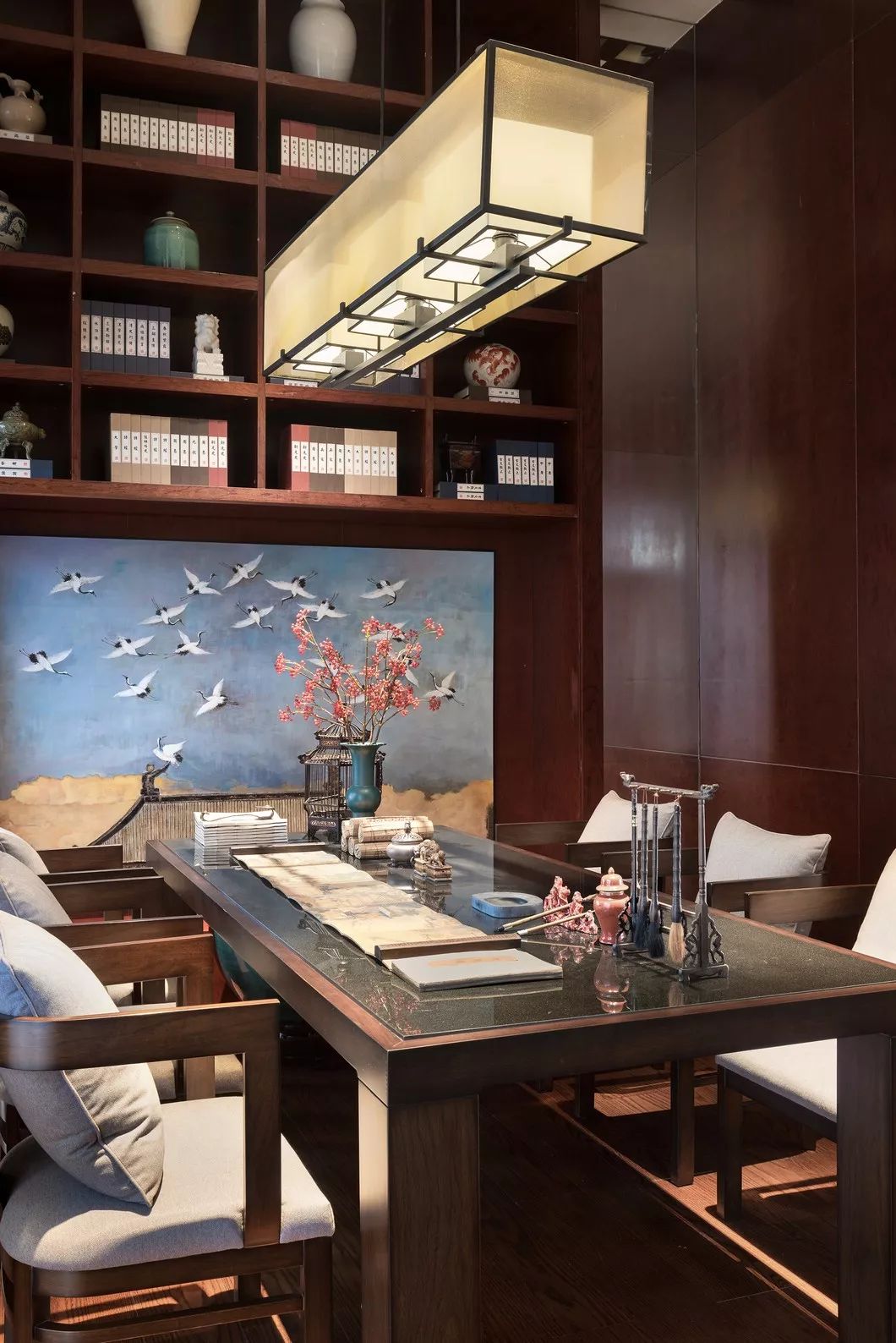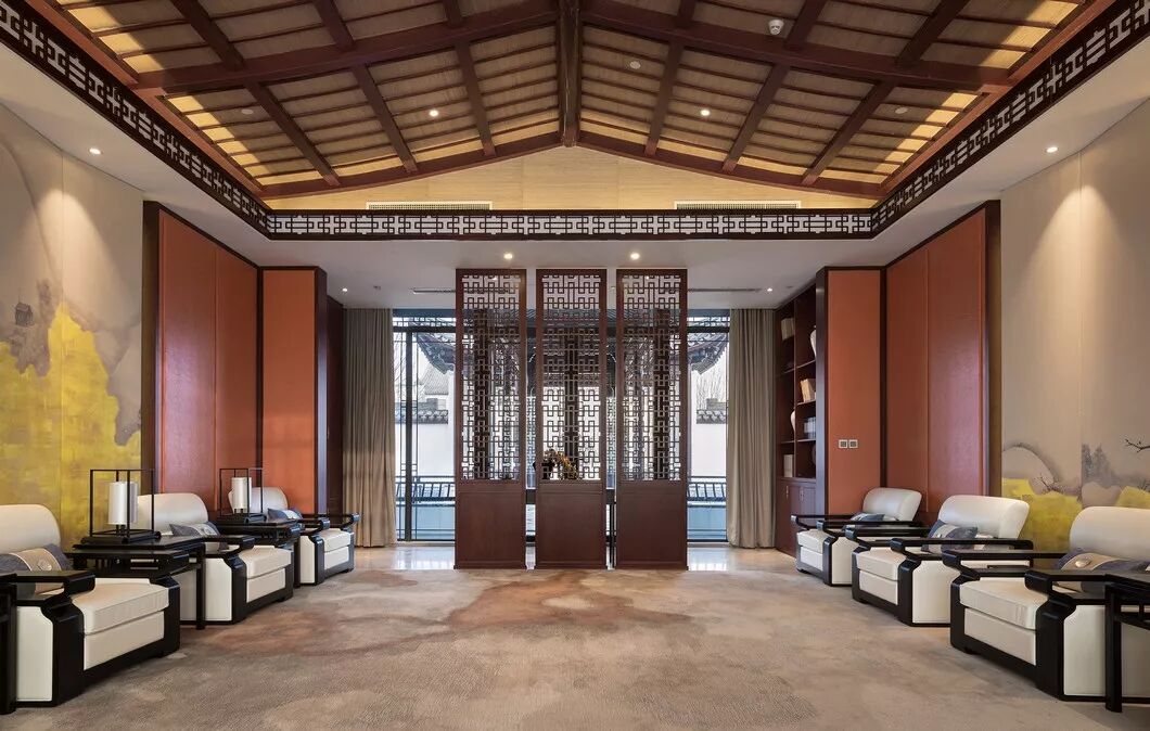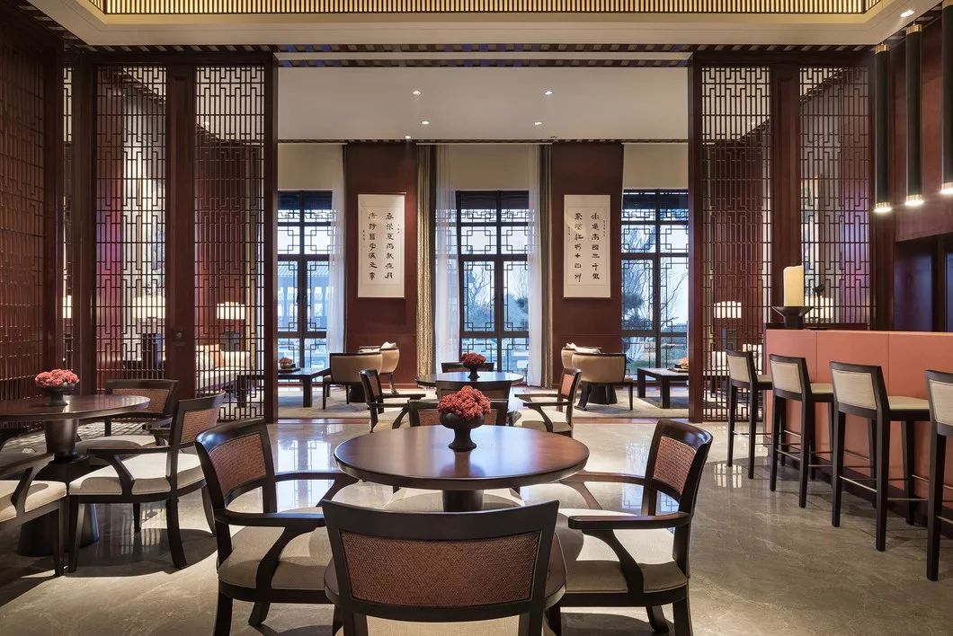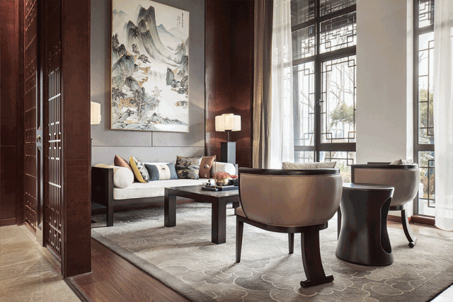 沉着的木散发着清雅之气,端庄的中式扶椅有着低调的奢贵感,中西结合的窗棂引入自然光照,空间情韵倏尔引发历史的遐想,又给人带来当下的舒适惬意享受。