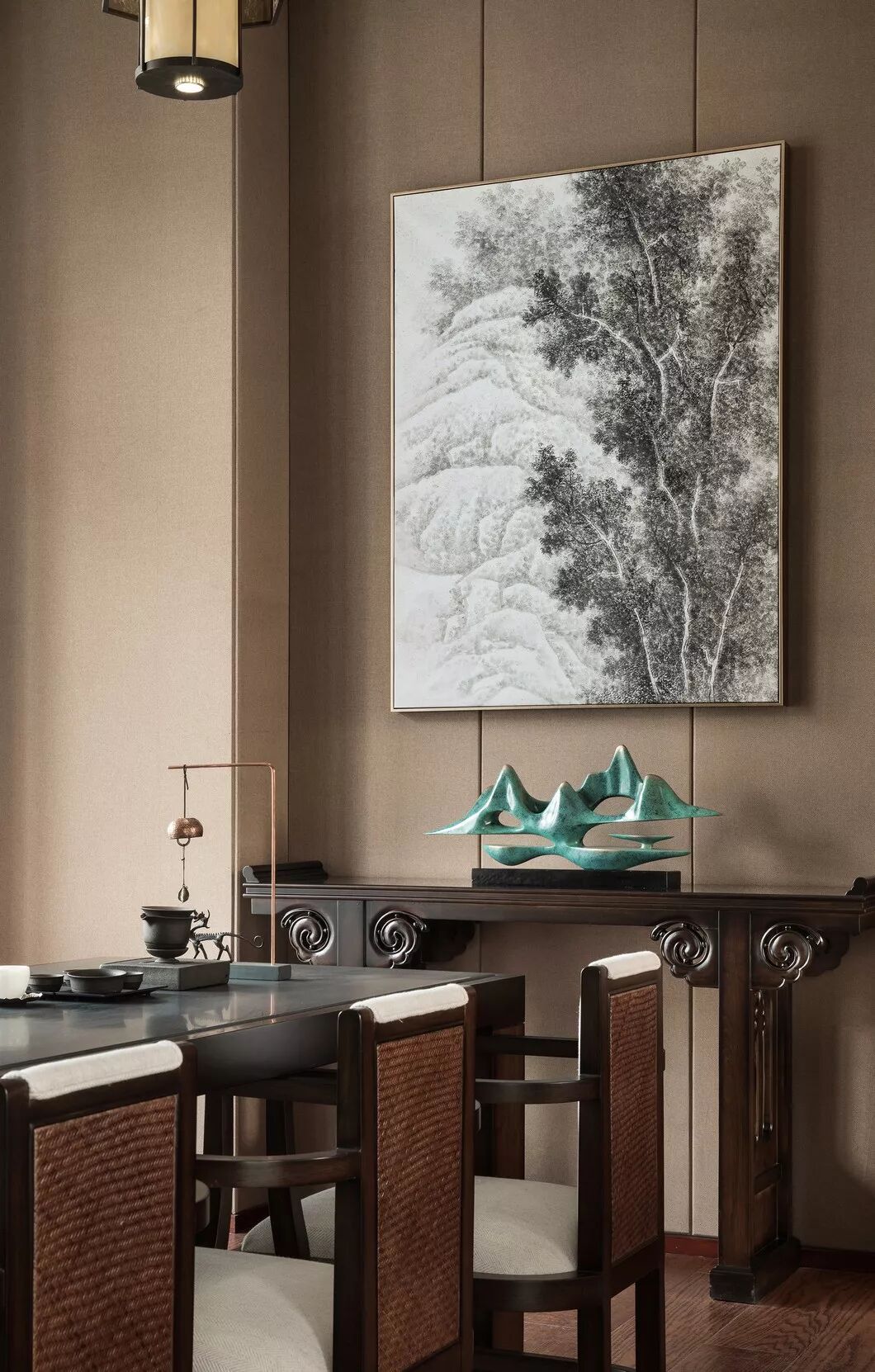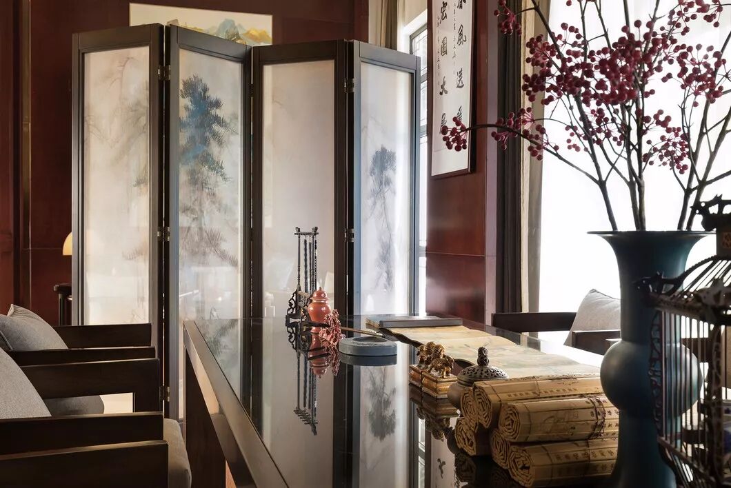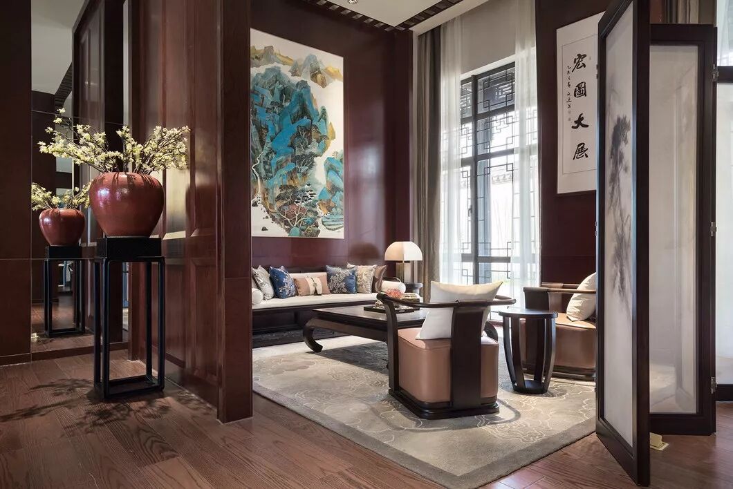 简洁雅致的中式隔断,浅色的云纹地毯,室内的谦和宁谧与窗外的悠悠景致悄然相应,一幅青绿山水画,别具风致,使中式情韵与空间设计融会贯通。