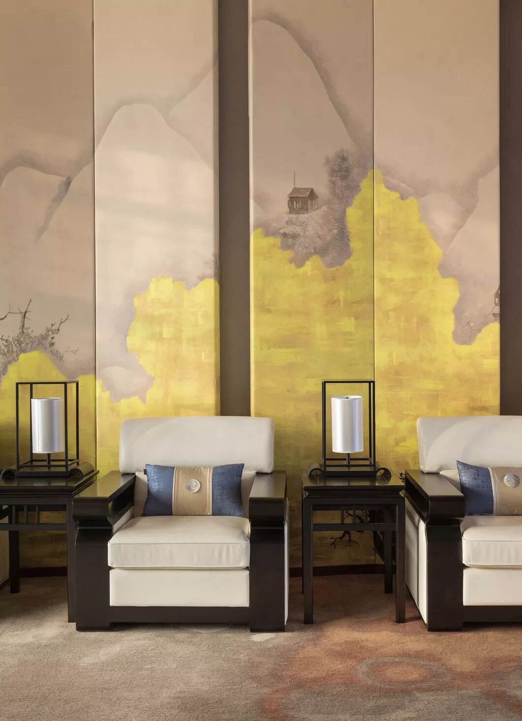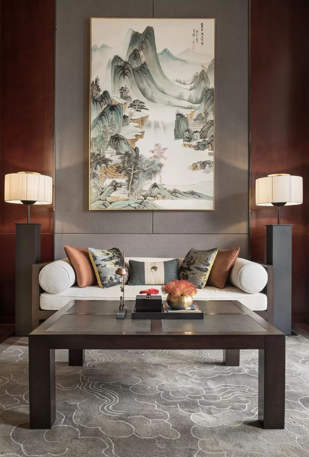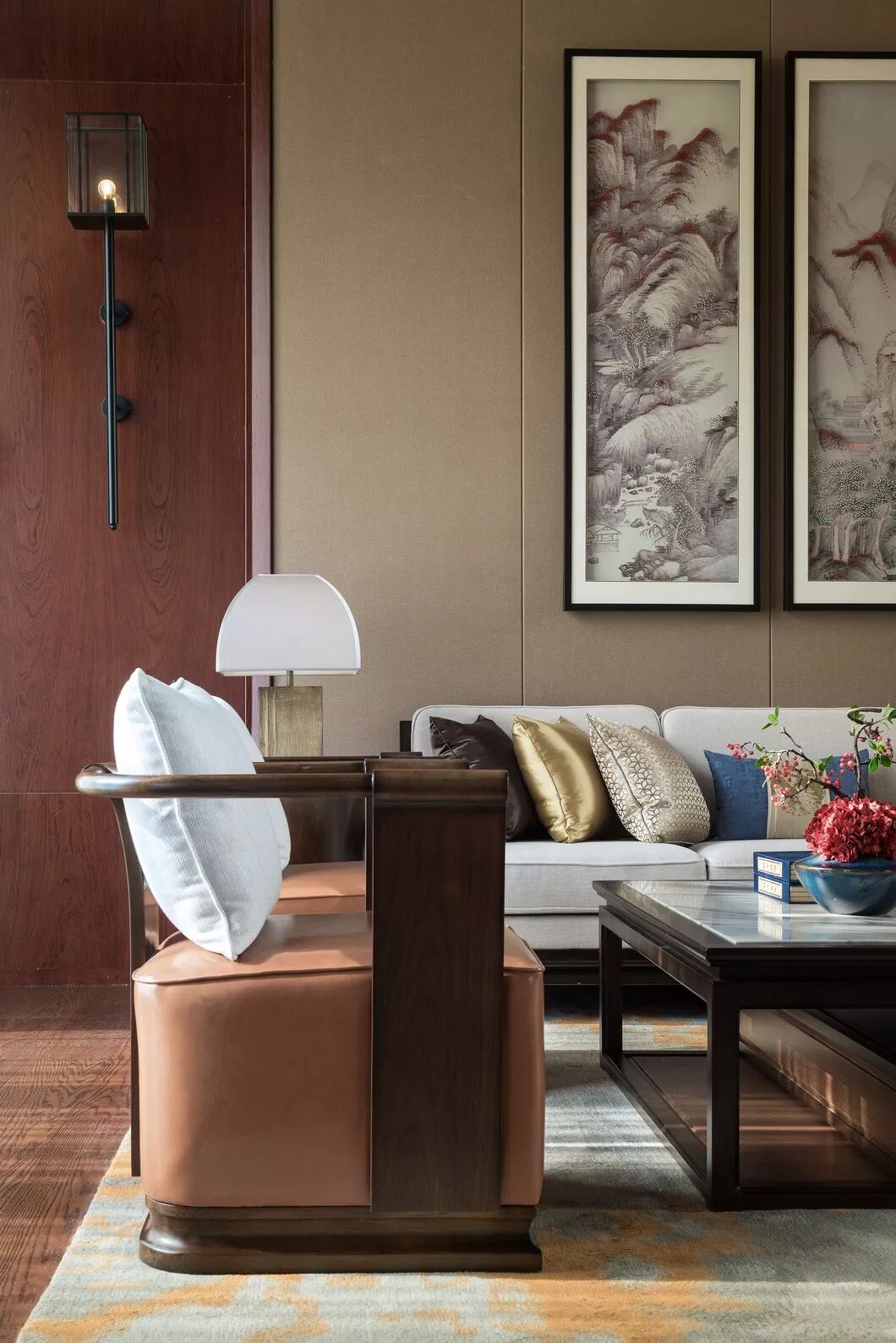 简洁雅致的中式隔断,浅色的云纹地毯,室内的谦和宁谧与窗外的悠悠景致悄然相应,一幅青绿山水画,别具风致,使中式情韵与空间设计融会贯通。