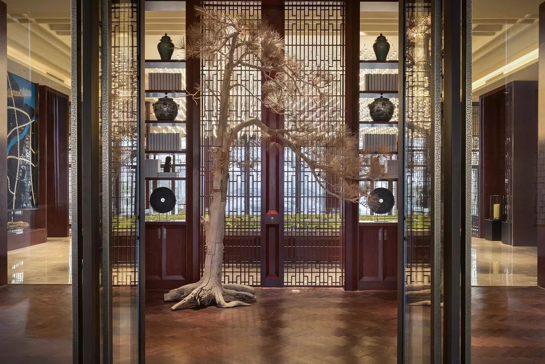 枯木造景伫立空间中央,枯木的疏淡、坚挺、空灵,营造成静寂、旷逸、高古之气,赋予空间独特的审美特质和精神气格。