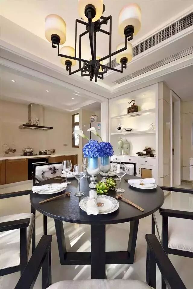 不大的空间中,选了新中式水曲柳实木圆形餐桌~黑色的铁艺吊灯与餐桌椅颜色相呼应