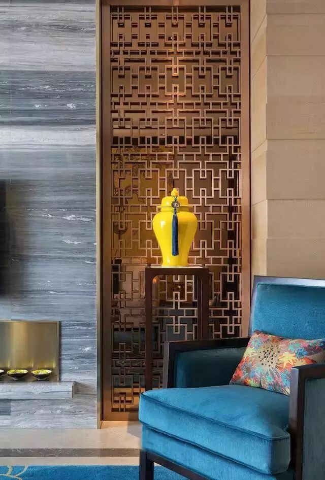 从客厅中的整个布局来看,充满了浓浓的中式韵味,尤其是沙发墙和镂空隔断屏风,将这种氛围展现得淋漓尽致,另外蓝色地毯的运用也使空间增添了一抹活力,搭上米白色沙发,恰到好处