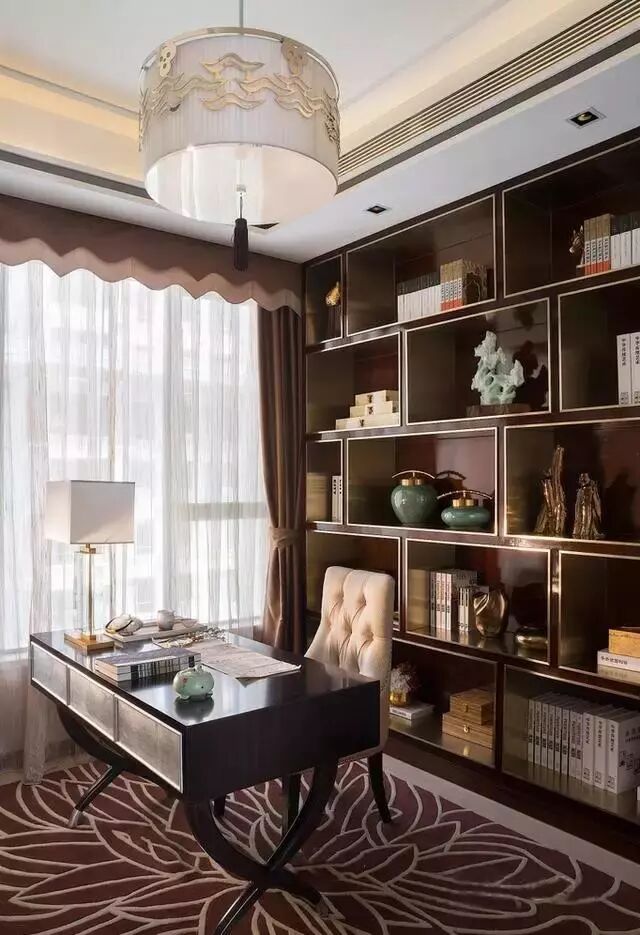书房看上去十分大气,花瓣形的地毯也呈现出一个绝美的模样,藏书的柜子,看起来精致感十足,圆形的灯具则增添了一抹古典的气息